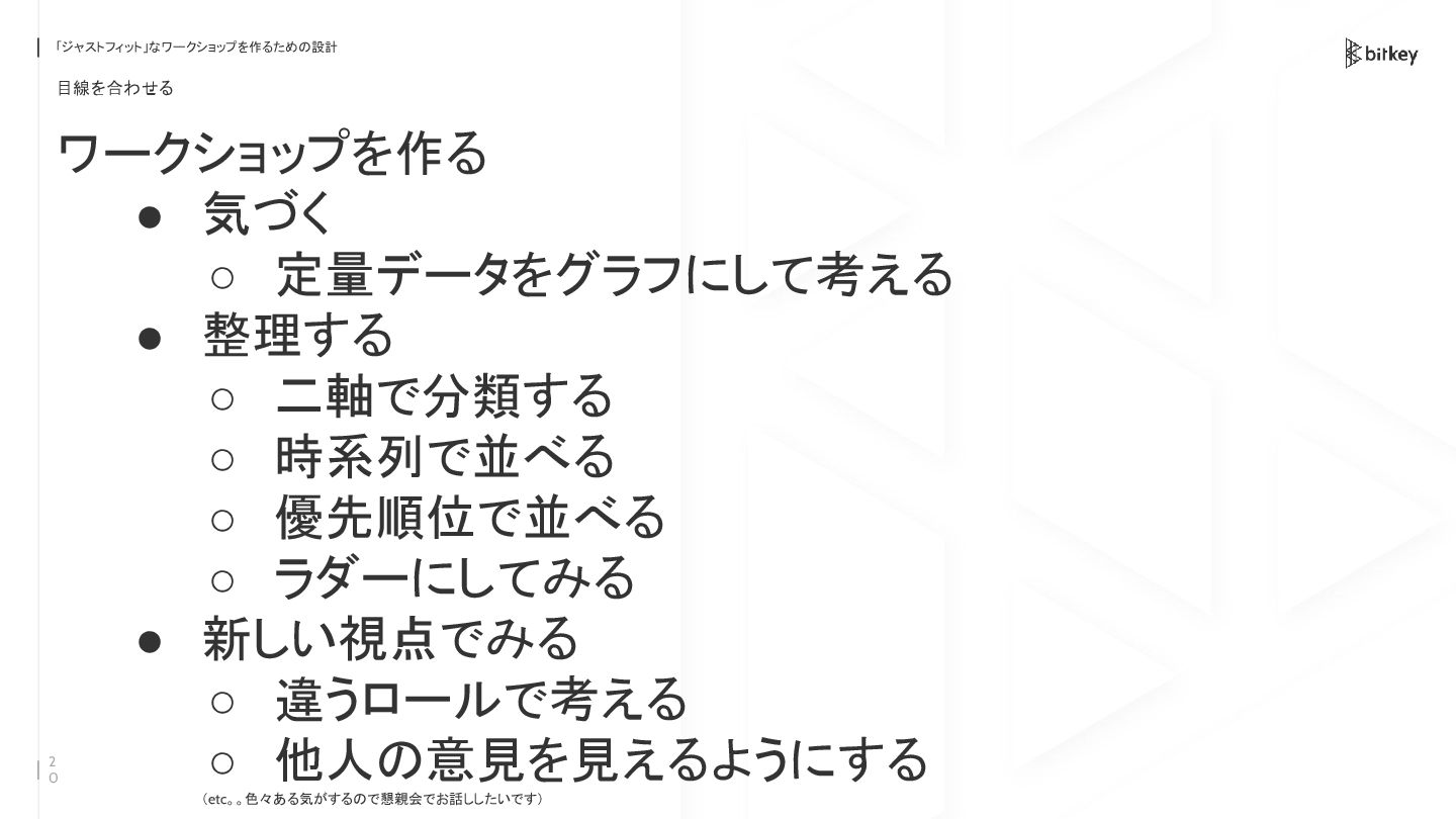 整理する ◦ 二軸で分類する ◦ 時系列で並べる ◦ 優先順位で並べる ◦ ラダーにしてみる • 新しい視点でみる ◦ 違うロールで考える ◦ 他人の意見を見えるようにする (etc。。色々ある気がするので懇親会でお話ししたいです)