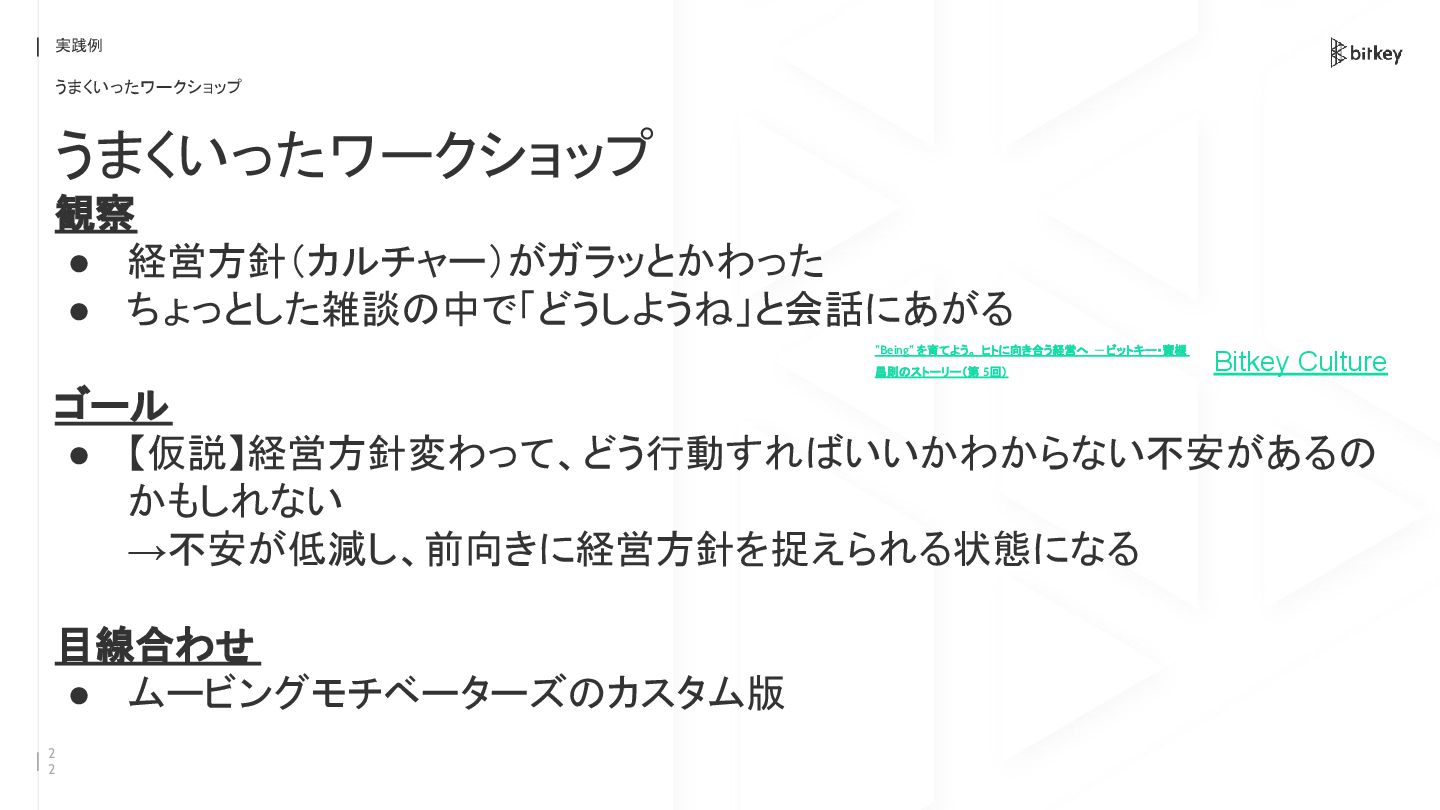 ゴール • 【仮説】経営方針変わって、どう行動すればいいかわからない不安があるの かもしれない →不安が低減し、前向きに経営方針を捉えられる状態になる 目線合わせ • ムービングモチベーターズのカスタム版 Bitkey Culture ”Being” を育てよう。 ヒトに向き合う経営へ — ビットキー・寳槻 昌則のストーリー(第 5回)
