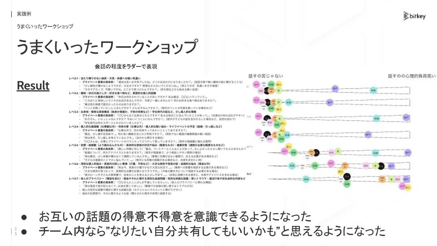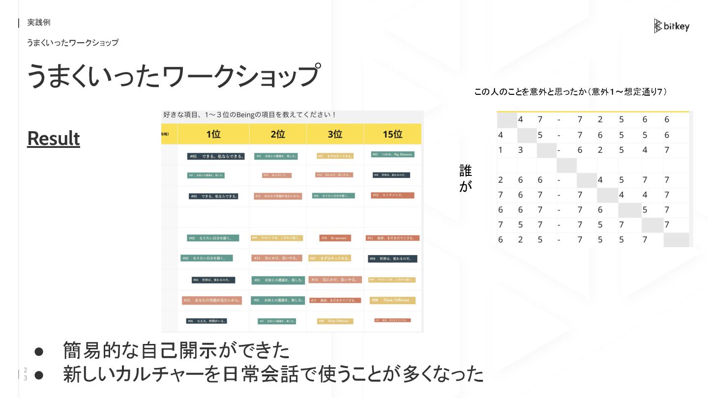 7. 2 2 実践例 うまくいったワークショップ うまくいったワークショップ 観察 • 経営方針(カルチャー)がガラッとかわった • ちょっとした雑談の中で「どうしようね」と会話にあがる