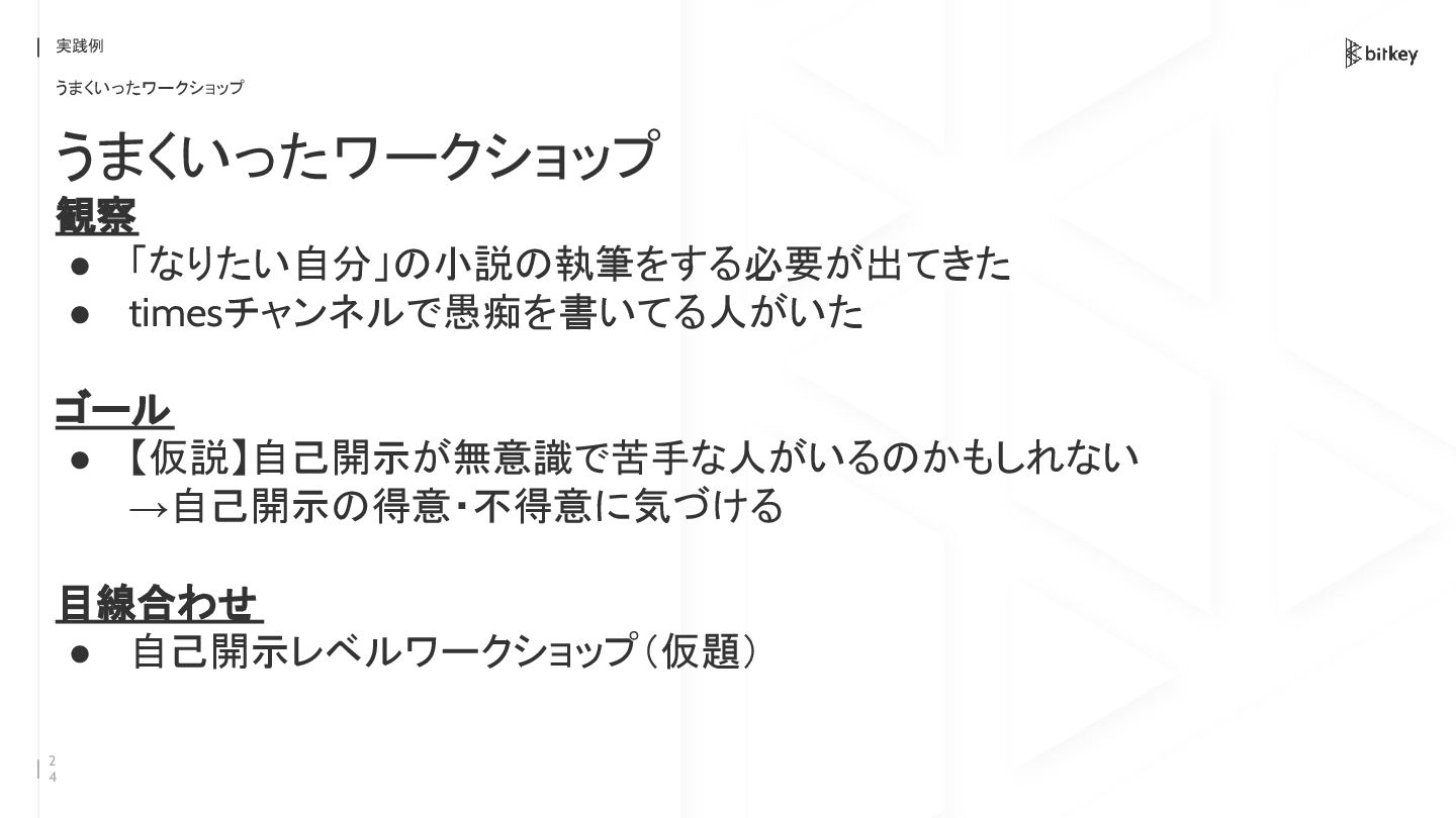 ゴール • 【仮説】自己開示が無意識で苦手な人がいるのかもしれない →自己開示の得意・不得意に気づける 目線合わせ • 自己開示レベルワークショップ(仮題)