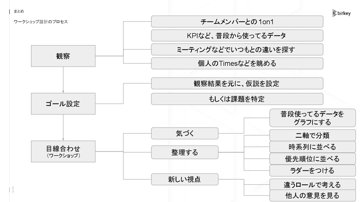 9. 2 7 まとめ ワークショップ設計のプロセス 観察 ゴール設定 チームメンバーとの1on1 ミーティングなどでいつもとの違いを探す 目線合わせ (ワークショップ)