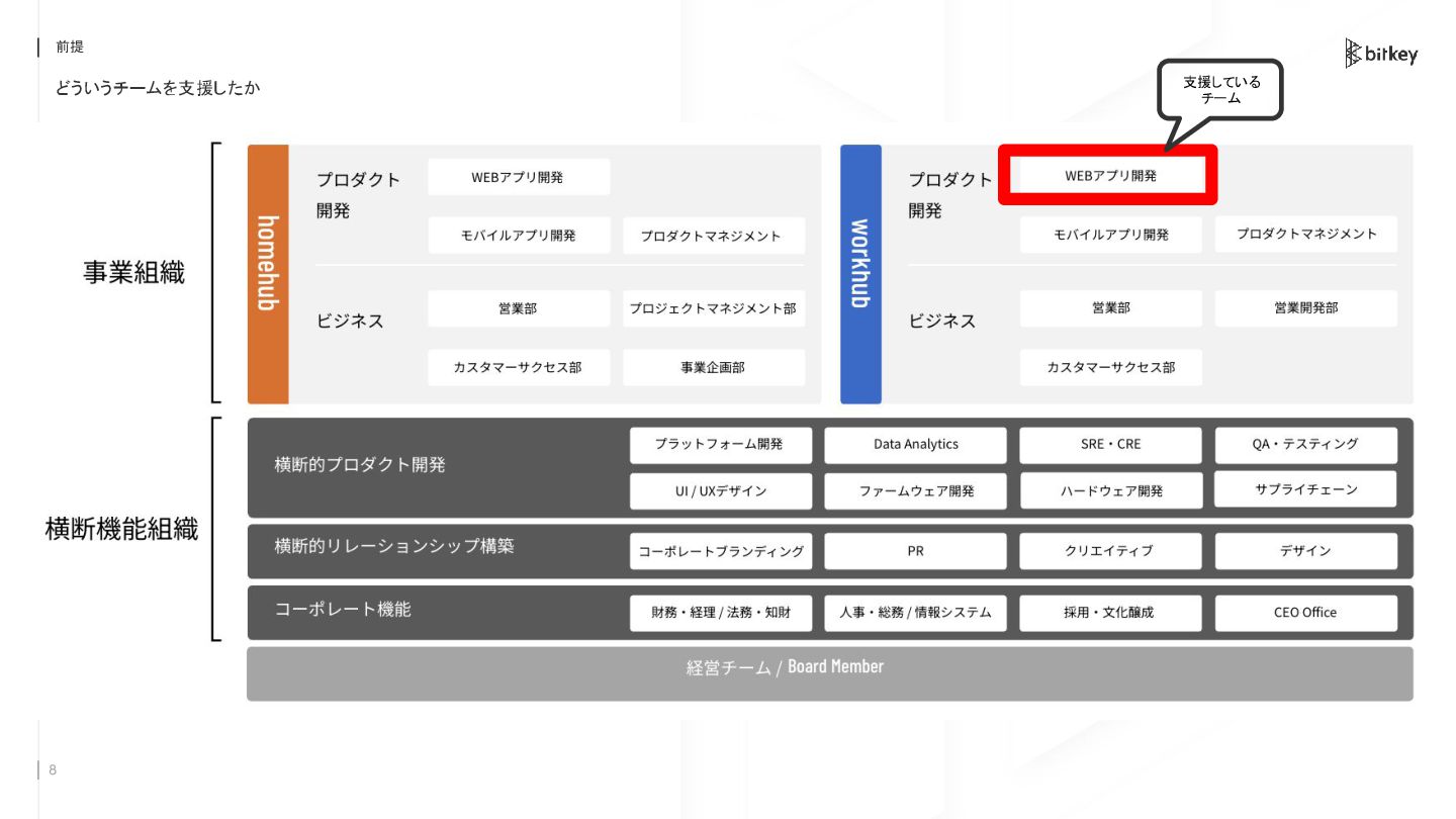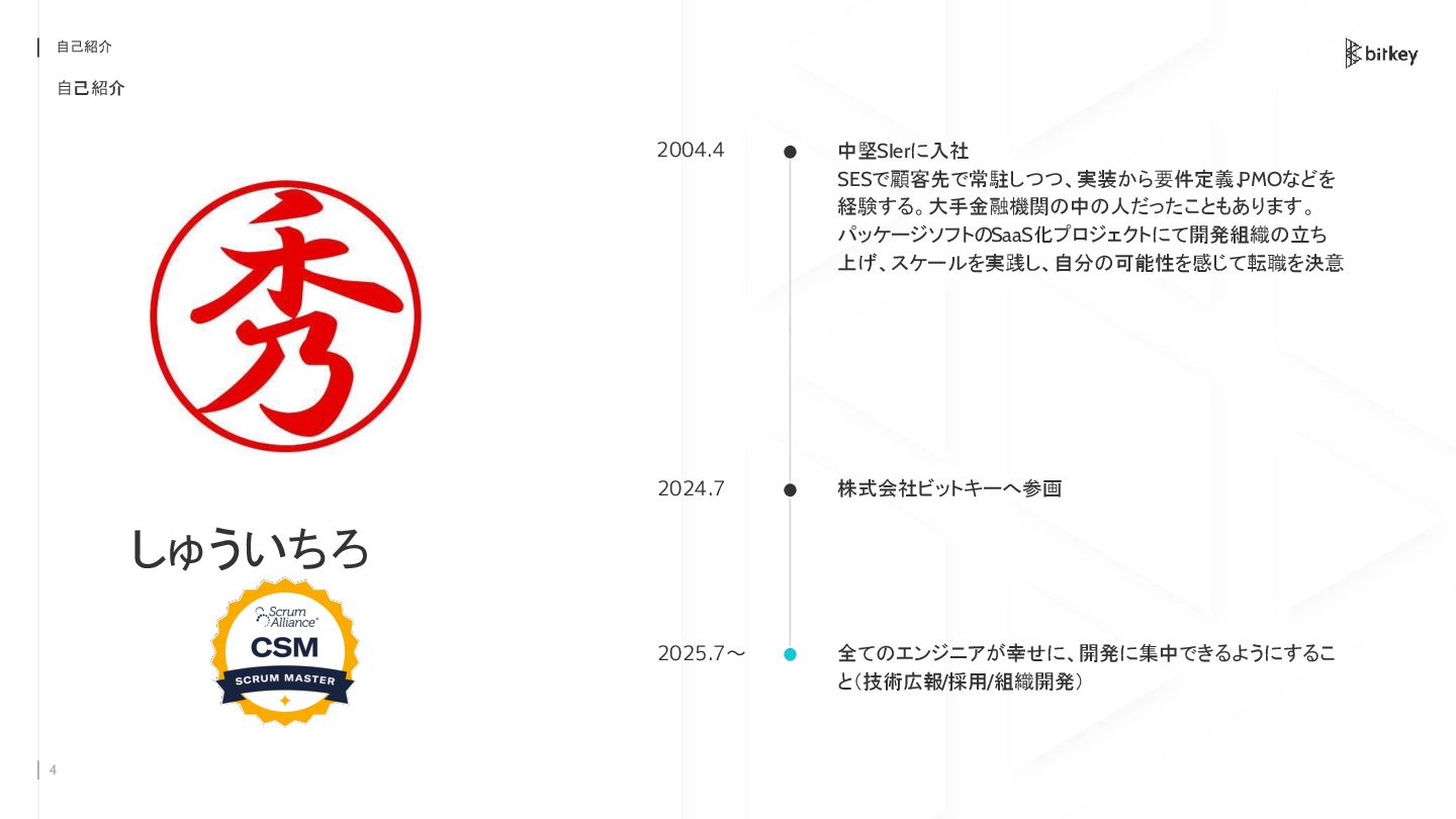 パッケージソフトのSaaS化プロジェクトにて開発組織の立ち 上げ、スケールを実践し、自分の可能性を感じて転職を決意 株式会社ビットキーへ参画 2025.7〜 全てのエンジニアが幸せに、開発に集中できるようにするこ と(技術広報/採用/組織開発)