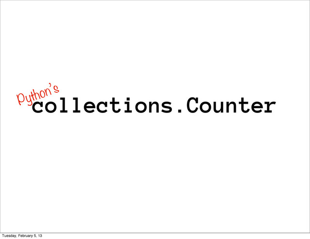counts for existing keys >>> c.update({'foo': 1}) >>> c Counter({'widgets': 1, 'foo': 1}) # calling `update` again will increment # the value of 'foo' >>> c.update({'foo': 1}) >>> c Counter({'widgets': 1, 'foo': 2}) Tuesday, February 5, 13
