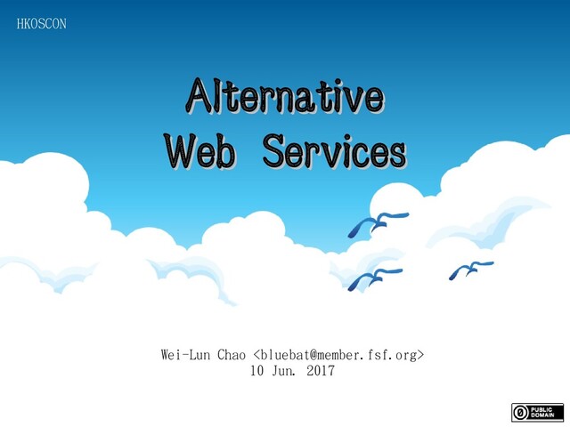 網頁應用服務替代方案 https://github.com/bluebat/.presentations/raw/master/alternative-web-services.odp https://www.facebook.com/hkoscon/videos/1936170426651165/