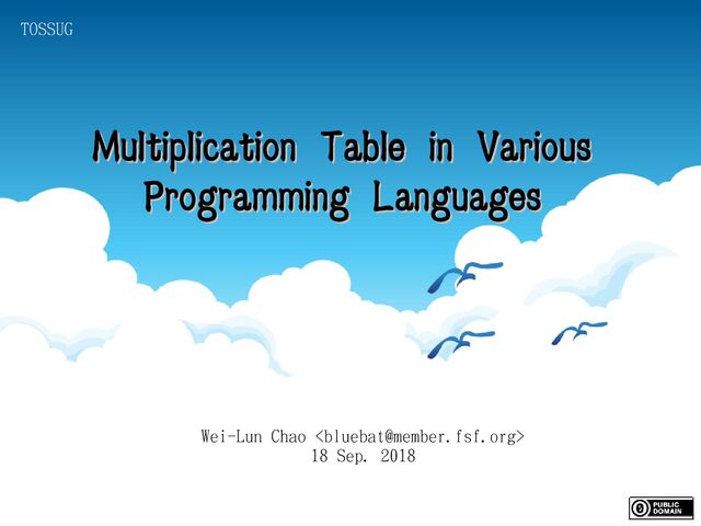 mt9x9.asm && ; ld mt9x9.o -o mt9x9 && ./mt9x9 GLOBAL _start SECTION .data i: DB 0 j: DB 0 k: DB 0 ten: DB 10 item: DB '9x9=81', 9 nl: DB 10 SECTION .text _start: MOV BYTE[i], 1 loop_i: MOV BYTE[j], 1 loop_j: MOV BYTE[k], 0 loop_k: MOV AL, [k] ADD AL, [i] ADD AL, 48 MOV BYTE[item], AL MOV AL, [j] ADD AL, 48 MOV BYTE[item+2], AL MOV AL, [k] ADD AL, [i] MUL BYTE[j] CMP AL, [ten] JB if_then DIV BYTE[ten] ADD AL, 48 MOV BYTE[item+4], AL ADD AH, 48 MOV BYTE[item+5], AH JMP if_end ; nasm -f elf64 mt9x9.asm && ; ld mt9x9.o -o mt9x9 && ./mt9x9 GLOBAL _start SECTION .data i: DB 0 j: DB 0 k: DB 0 ten: DB 10 item: DB '9x9=81', 9 nl: DB 10 SECTION .text _start: MOV BYTE[i], 1 loop_i: MOV BYTE[j], 1 loop_j: MOV BYTE[k], 0 loop_k: MOV AL, [k] ADD AL, [i] ADD AL, 48 MOV BYTE[item], AL MOV AL, [j] ADD AL, 48 MOV BYTE[item+2], AL MOV AL, [k] ADD AL, [i] MUL BYTE[j] CMP AL, [ten] JB if_then DIV BYTE[ten] ADD AL, 48 MOV BYTE[item+4], AL ADD AH, 48 MOV BYTE[item+5], AH JMP if_end Assembly(Intel) Assembly(AT&T) if_then: ADD AL, 48 MOV BYTE[item+4], ' ' MOV BYTE[item+5], AL if_end: MOV RAX, 1 MOV RDI, 1 MOV RSI, item MOV RDX, 7 SYSCALL INC BYTE[k] CMP BYTE[k], 2 JBE loop_k CALL newline INC BYTE[j] CMP BYTE[j], 9 JBE loop_j CALL newline ADD BYTE[i], 3 CMP BYTE[i], 9 JBE loop_i MOV RAX, 60 XOR RDI, RDI SYSCALL newline: MOV RAX, 1 MOV RDI, 1 MOV RSI, nl MOV RDX, 1 SYSCALL RET if_then: ADD AL, 48 MOV BYTE[item+4], ' ' MOV BYTE[item+5], AL if_end: MOV RAX, 1 MOV RDI, 1 MOV RSI, item MOV RDX, 7 SYSCALL INC BYTE[k] CMP BYTE[k], 2 JBE loop_k CALL newline INC BYTE[j] CMP BYTE[j], 9 JBE loop_j CALL newline ADD BYTE[i], 3 CMP BYTE[i], 9 JBE loop_i MOV RAX, 60 XOR RDI, RDI SYSCALL newline: MOV RAX, 1 MOV RDI, 1 MOV RSI, nl MOV RDX, 1 SYSCALL RET # as mt9x9.s -o mt9x9.o && # ld mt9x9.o -o mt9x9 && ./mt9x9 .global _start .data i: .byte 0 j: .byte 0 k: .byte 0 ten: .byte 10 item: .ascii "9x9=81\t" nl: .ascii "\n" .text _start: movb $1, i loop_i: movb $1, j loop_j: movb $0, k loop_k: movb k, %al addb i, %al addb $48, %al movb %al, item movb j, %al addb $48, %al movb %al, item+2 movb k, %al addb i, %al mulb j cmpb ten, %al jb if_then divb ten addb $48, %al movb %al, item+4 addb $48, %ah movb %ah, item+5 jmp if_end # as mt9x9.s -o mt9x9.o && # ld mt9x9.o -o mt9x9 && ./mt9x9 .global _start .data i: .byte 0 j: .byte 0 k: .byte 0 ten: .byte 10 item: .ascii "9x9=81\t" nl: .ascii "\n" .text _start: movb $1, i loop_i: movb $1, j loop_j: movb $0, k loop_k: movb k, %al addb i, %al addb $48, %al movb %al, item movb j, %al addb $48, %al movb %al, item+2 movb k, %al addb i, %al mulb j cmpb ten, %al jb if_then divb ten addb $48, %al movb %al, item+4 addb $48, %ah movb %ah, item+5 jmp if_end if_then: addb $48, %al movb $32, item+4 movb %al, item+5 if_end: mov $1, %rax mov $1, %rdi mov $item, %rsi mov $7, %rdx syscall incb k cmpb $2, k jbe loop_k call newline incb j cmpb $9, j jbe loop_j call newline addb $3, i cmpb $9, i jbe loop_i mov $60, %rax xor %rdi, %rdi syscall newline: mov $1, %rax mov $1, %rdi mov $nl, %rsi mov $1, %rdx syscall ret if_then: addb $48, %al movb $32, item+4 movb %al, item+5 if_end: mov $1, %rax mov $1, %rdi mov $item, %rsi mov $7, %rdx syscall incb k cmpb $2, k jbe loop_k call newline incb j cmpb $9, j jbe loop_j call newline addb $3, i cmpb $9, i jbe loop_i mov $60, %rax xor %rdi, %rdi syscall newline: mov $1, %rax mov $1, %rdi mov $nl, %rsi mov $1, %rdx syscall ret