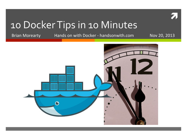 A condensed version of 15 Docker Tips in 5 Minutes. Five fewer tips, five more minutes. :-) Lightning talk I gave at a Docker meetup at RelateIQ on Nov. 20, 2013.