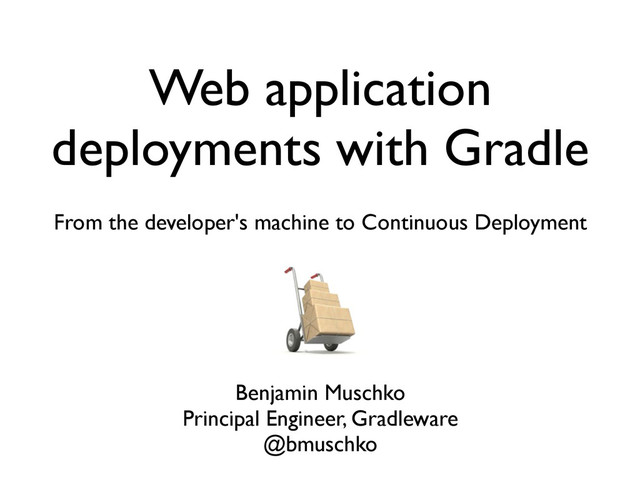 Web applications live and breathe in their runtime environment, the web container. But what is the best way to install the relevant artifacts during development or as part of your deployment pipeline? In this talk, we will discuss the techniques and tooling required to implement efficient, flexible, and most importantly, automated deployment strategies to local and remote web containers with Gradle.
