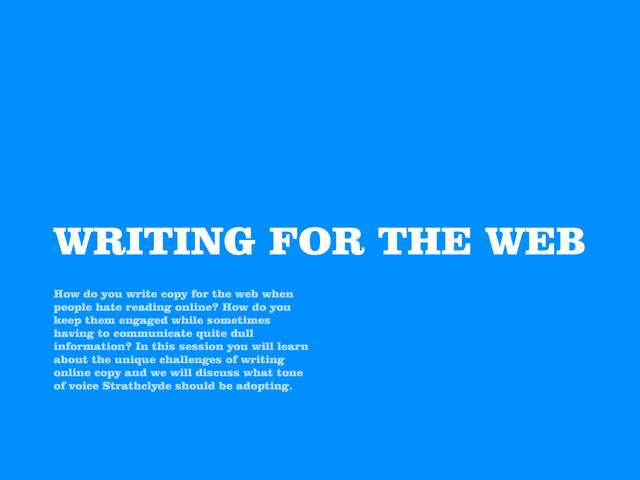 How do you write copy for the web when people hate reading online? How do you keep them engaged while sometimes having to communicate quite dull information? In this session you will learn about the unique challenges of writing online copy and we will discuss what tone of voice Strathclyde should be adopting.