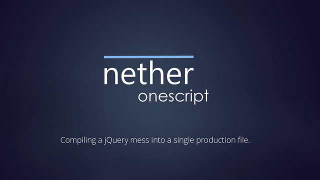 using jQuery and then search for addtional plugins over the course of a year. <script src=“/share/jquery/jquery.min.js”></script> <script src=“/share/jquery/jquery.cookie.min.js”></script> <script src=“/share/jquery/jquery.purl.min.js”></script> <script src=“/share/jquery/jquery.datepicker.min.js”></script> <script src=“/share/jquery/jquery.easing.min.js”></script> This sucks because browsers (might) make multiple connections to load all these. Browsers will also need to delay execution as it waits for all the chunks to come in completely. Lets optimise this by compiling these down to 1 file instead, down to 1 big chunk it can just grab and go.