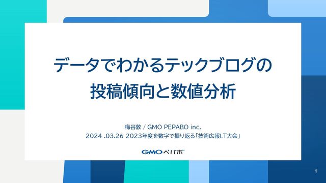 発表イベント:2023年度を数字で振り返る「技術広報LT大会」 テーマ:数字で振り返る技術広報 2024/03/26(火) の登壇資料 LT(5分)です。 https://smarthr.connpass.com/event/311062/