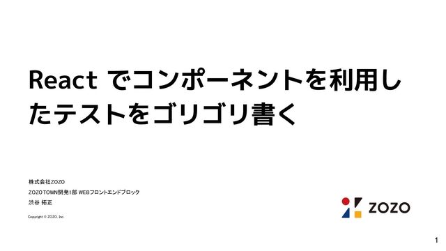 React でコンポーネントを利用し たテストをゴリゴリ書く 株式会社ZOZO ZOZOTOWN開発1部 WEBフロントエンドブロック 渋谷 拓正 Copyright ©