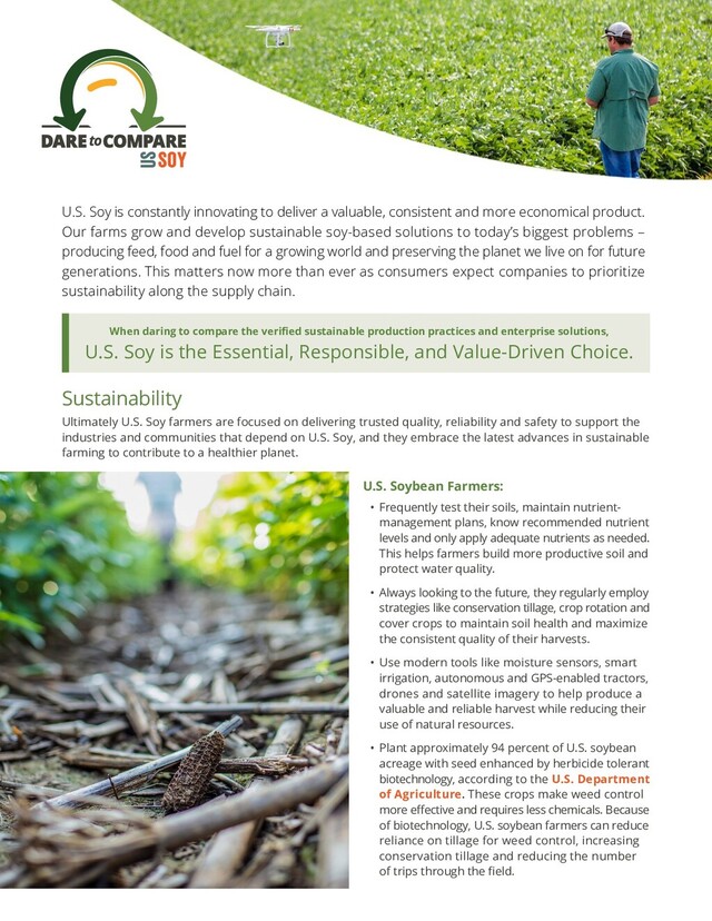 and more economical product. Our farms grow and develop sustainable soy-based solutions to today’s biggest problems – producing feed, food and fuel for a growing world and preserving the planet we live on for future generations. This matters now more than ever as consumers expect companies to prioritize sustainability along the supply chain. When daring to compare the verified sustainable production practices and enterprise solutions, U.S. Soy is the Essential, Responsible, and Value-Driven Choice. U.S. Soybean Farmers: • Frequently test their soils, maintain nutrient- management plans, know recommended nutrient levels and only apply adequate nutrients as needed. This helps farmers build more productive soil and protect water quality. • Always looking to the future, they regularly employ strategies like conservation tillage, crop rotation and cover crops to maintain soil health and maximize the consistent quality of their harvests. • Use modern tools like moisture sensors, smart irrigation, autonomous and GPS-enabled tractors, drones and satellite imagery to help produce a valuable and reliable harvest while reducing their use of natural resources. • Plant approximately 94 percent of U.S. soybean acreage with seed enhanced by herbicide tolerant biotechnology, according to the U.S. Department of Agriculture. These crops make weed control more effective and requires less chemicals. Because of biotechnology, U.S. soybean farmers can reduce reliance on tillage for weed control, increasing conservation tillage and reducing the number of trips through the field. Sustainability Ultimately U.S. Soy farmers are focused on delivering trusted quality, reliability and safety to support the industries and communities that depend on U.S. Soy, and they embrace the latest advances in sustainable farming to contribute to a healthier planet.