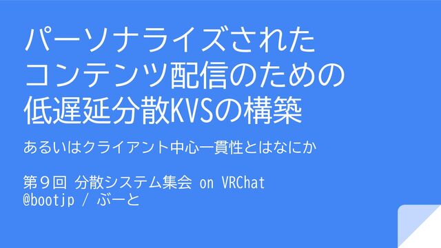 パーソナライズされた コンテンツ配信のための 低遅延分散KVSの構築 あるいはクライアント中心一貫性とはなにか 第9回 分散システム集会 on VRChat @bootjp /