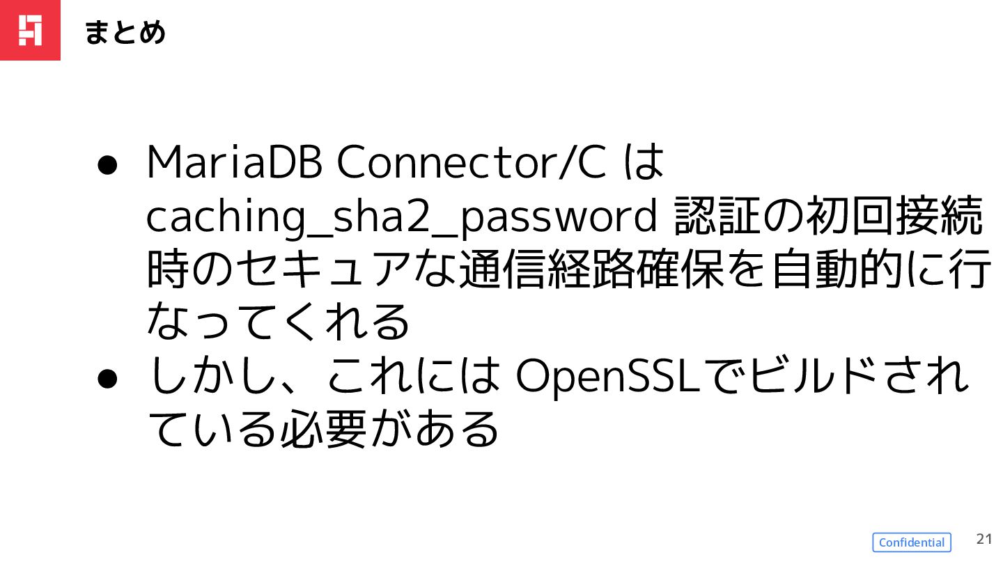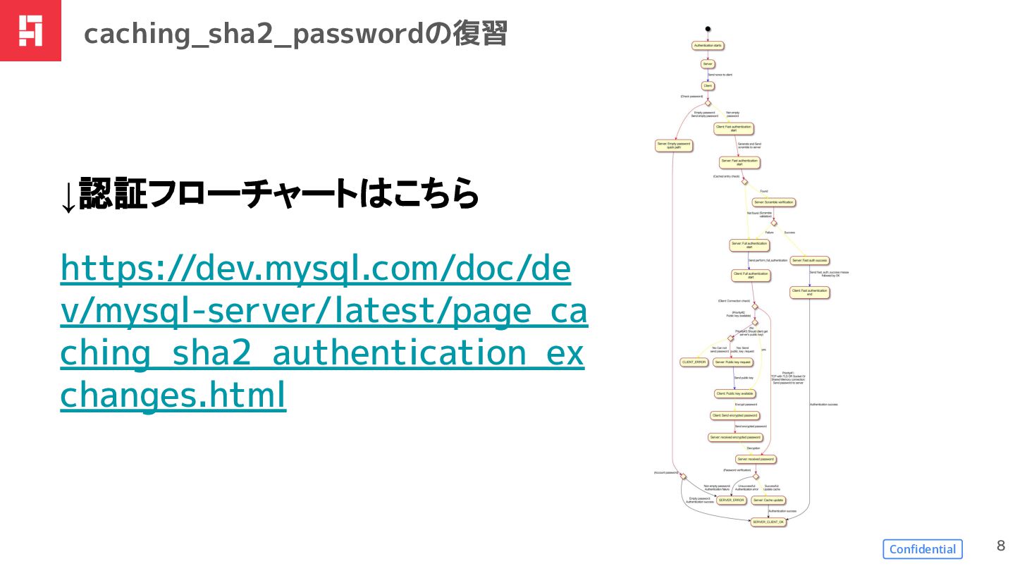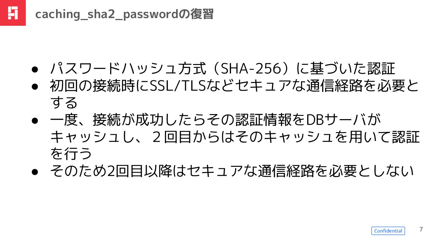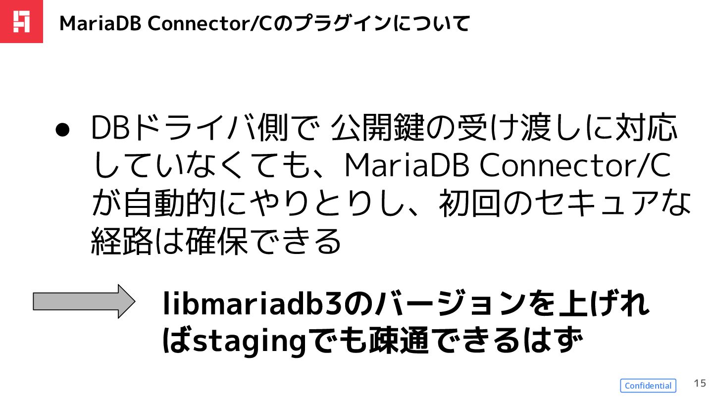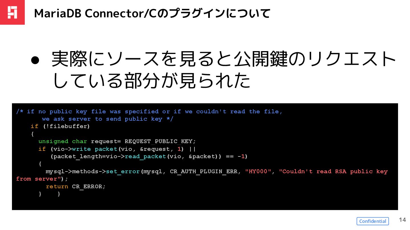 file was specified or if we couldn't read the file, we ask server to send public key */ if (!filebuffer) { unsigned char request= REQUEST_PUBLIC_KEY; if (vio->write_packet(vio, &request, 1) || (packet_length=vio->read_packet(vio, &packet)) == -1) { mysql->methods->set_error(mysql, CR_AUTH_PLUGIN_ERR, "HY000", "Couldn't read RSA public key from server"); return CR_ERROR; } } • 実際にソースを見ると公開鍵のリクエスト している部分が見られた