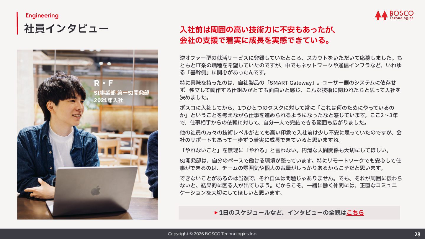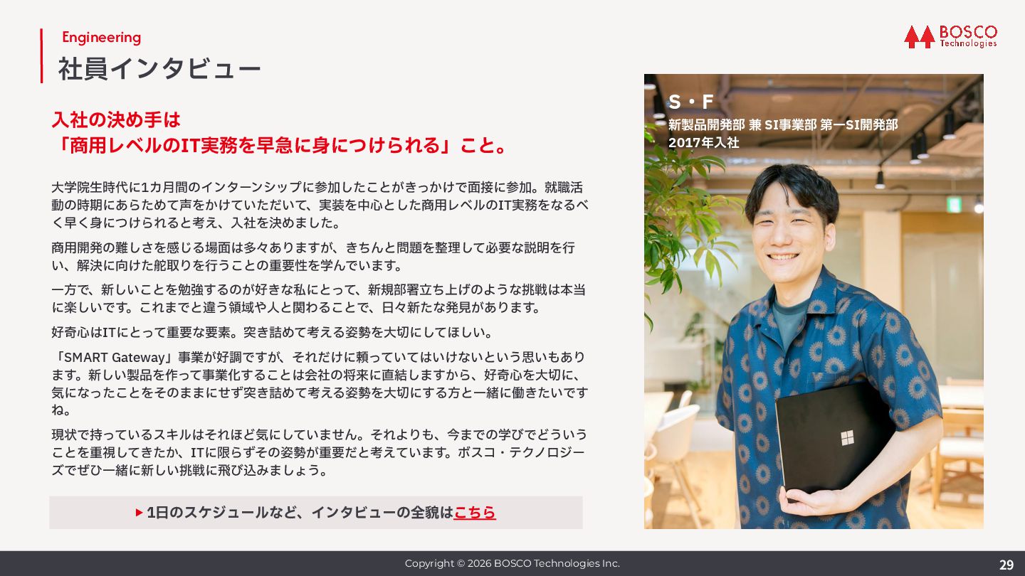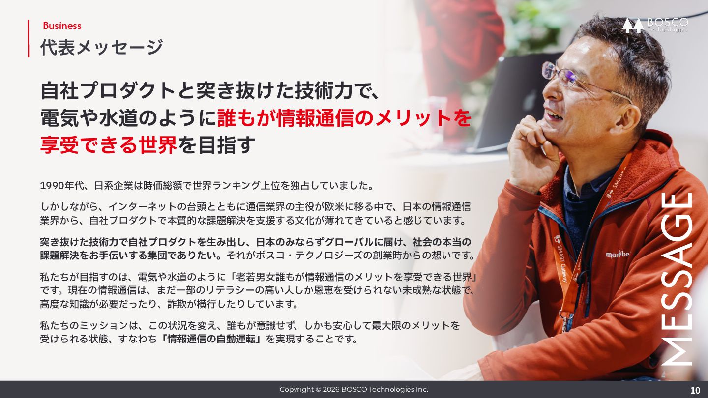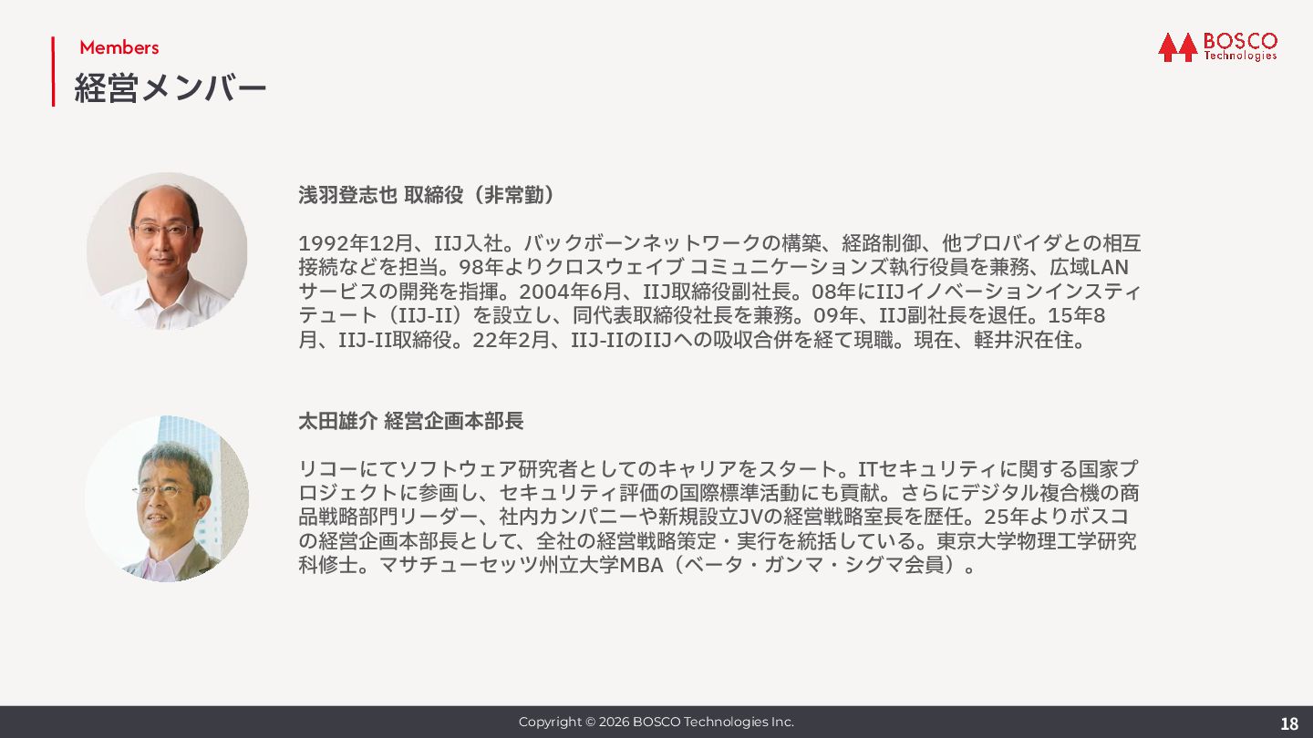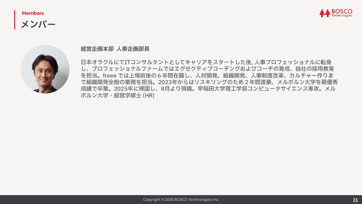 ボスコ創業メンバー。⼊社後は情報通信・放送などの分野の顧客にインフラ開発・導⼊を⾏いながら、 研究活動も継続し委員会の委員⻑なども務める。また⾃社プロダクト開発でも重要な役割を担ってい る。⼤阪市⽴⼤学 前期博⼠課程修了。 実績 ICM 研究会専⾨委員、NV 研究会専⾨委員、APNOMS 2017 Exhibition Co-Chair, 2019 Exhibition / Demo Session Co-Chair, 2020 Exhibition Co-Chair, ICM 研究会幹事補佐 2019, 幹事 2020 -- 2021, ICM 研究会副委員⻑ 2024, NetSoft 2021 Web Co-Chair, APNOMS 2021 Poster Co-Chair, 2022 TPC Co-Chair, APNOMS 2023 Secretary, NOMS 2024 Secretary, Many other TPC member. ICM 研究賞 2013, 2017, 2022, NOMS 2022 best reviewer award, IEICE 功労賞 2022 Enable Function 本部⻑ ⽇⽴製作所にてエンジニアとして勤務後、ソニー株式会社 VAIO事業部に転⾝、ラップトップPC VAIO の機構設計で活躍。その後夫の駐在を機にシアトルに渡⽶、帰国後はベンチャー企業で管理部⻑に就任 し数名から60名規模の組織への成⻑を牽引。ボスコ⼊社後は経営管理基盤の整備に⼤きく貢献してお り、⼊社半年で本部⻑に就任後、経理・法務・情シス・労務・総務など管理機能を統括している。