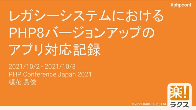 #phpconf ©2021 RAKUS Co., Ltd. #phpconf レガシーシステムにおける PHP8バージョンアップの アプリ対応記録 2021/10/2