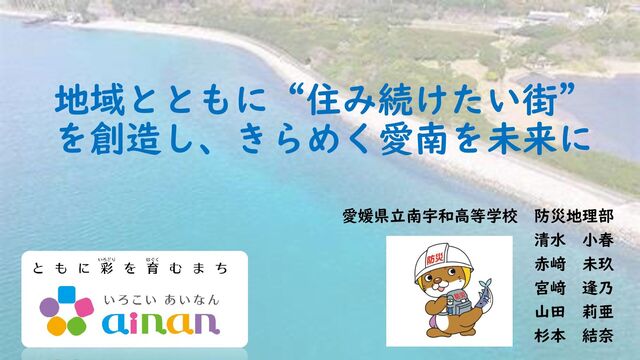 地域とともに“住み続けたい街” を創造し、きらめく愛南を未来に 愛媛県立南宇和高等学校 防災地理部 清水 小春 赤﨑 未玖 宮﨑 逢乃