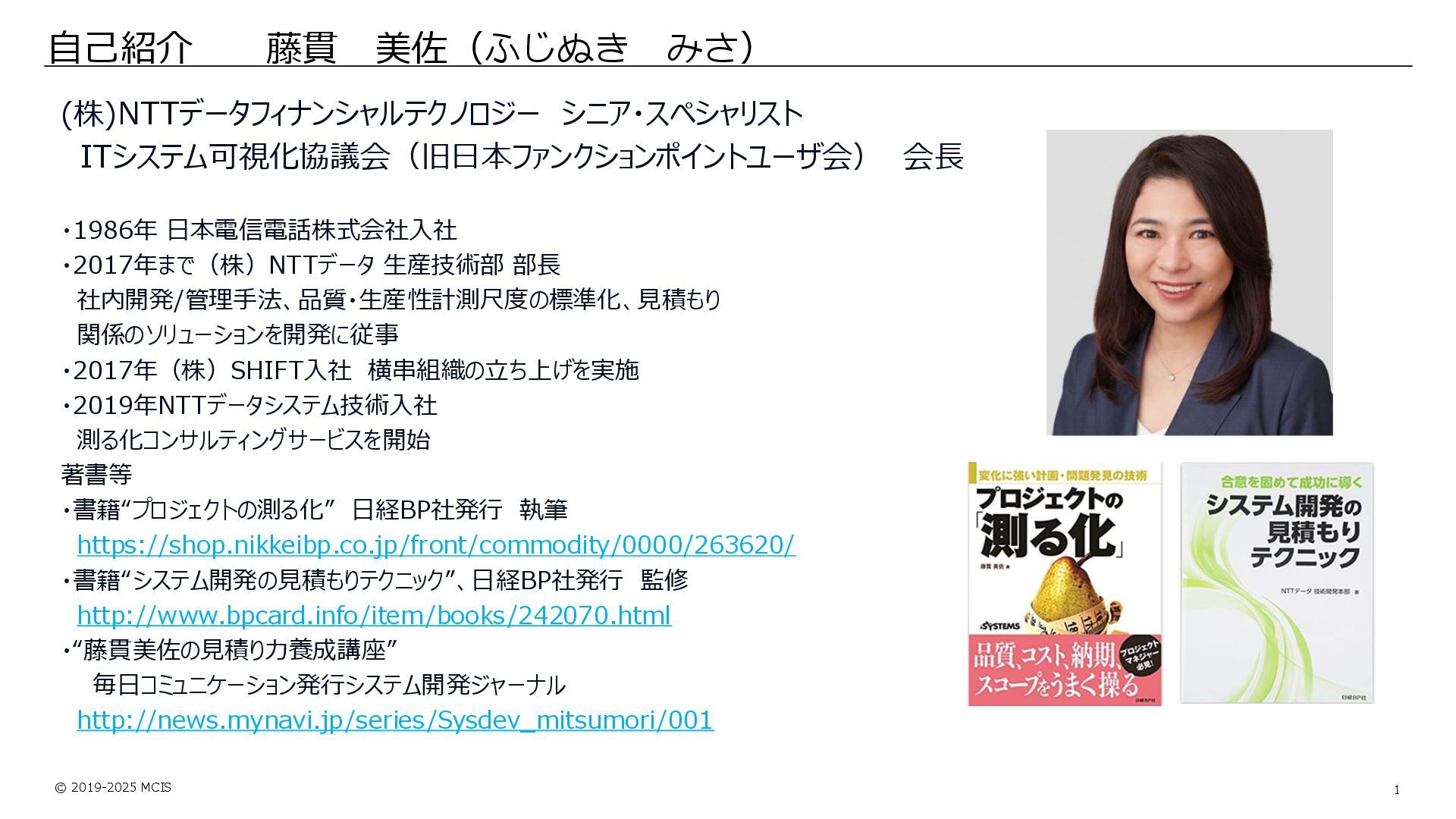 © 2019-2025 MCIS 1 自己紹介 藤貫 美佐(ふじぬき みさ) (株)NTTデータフィナンシャルテクノロジー シニア・スペシャリスト