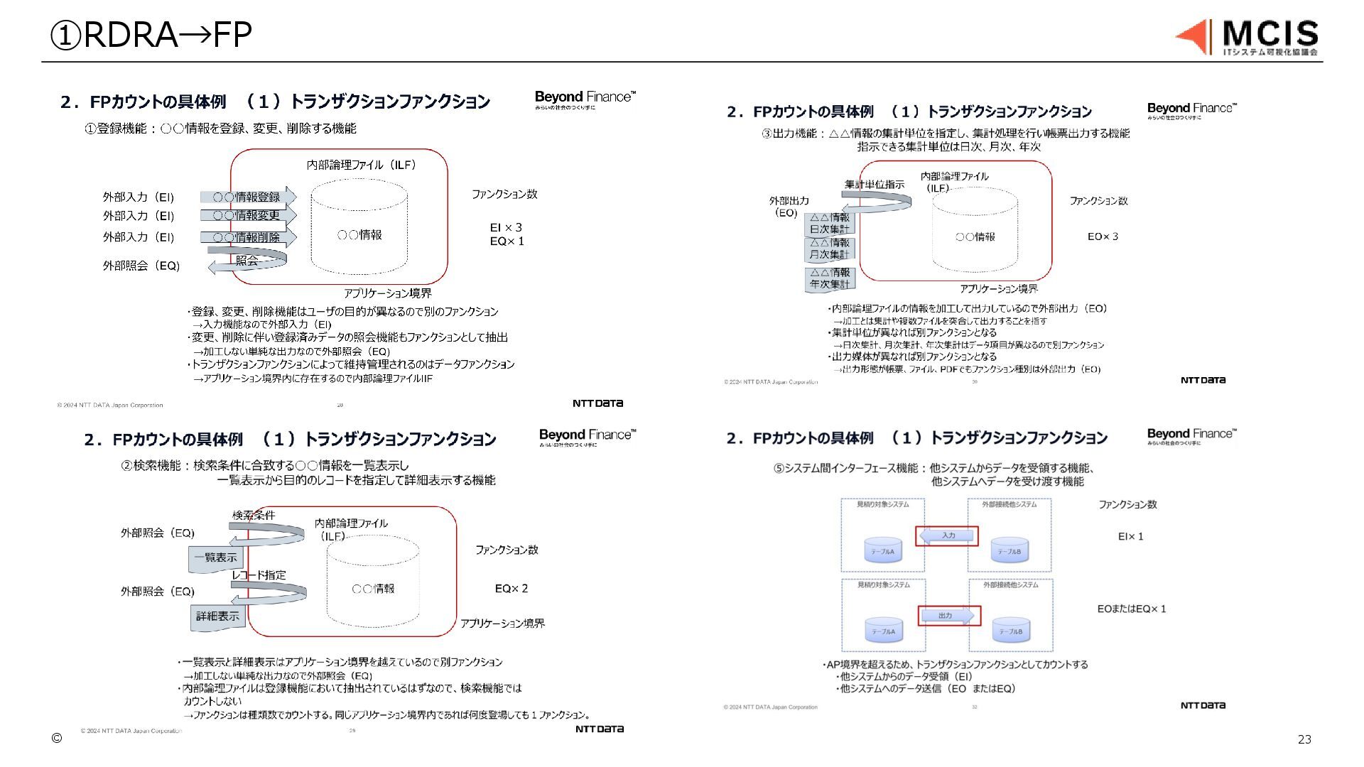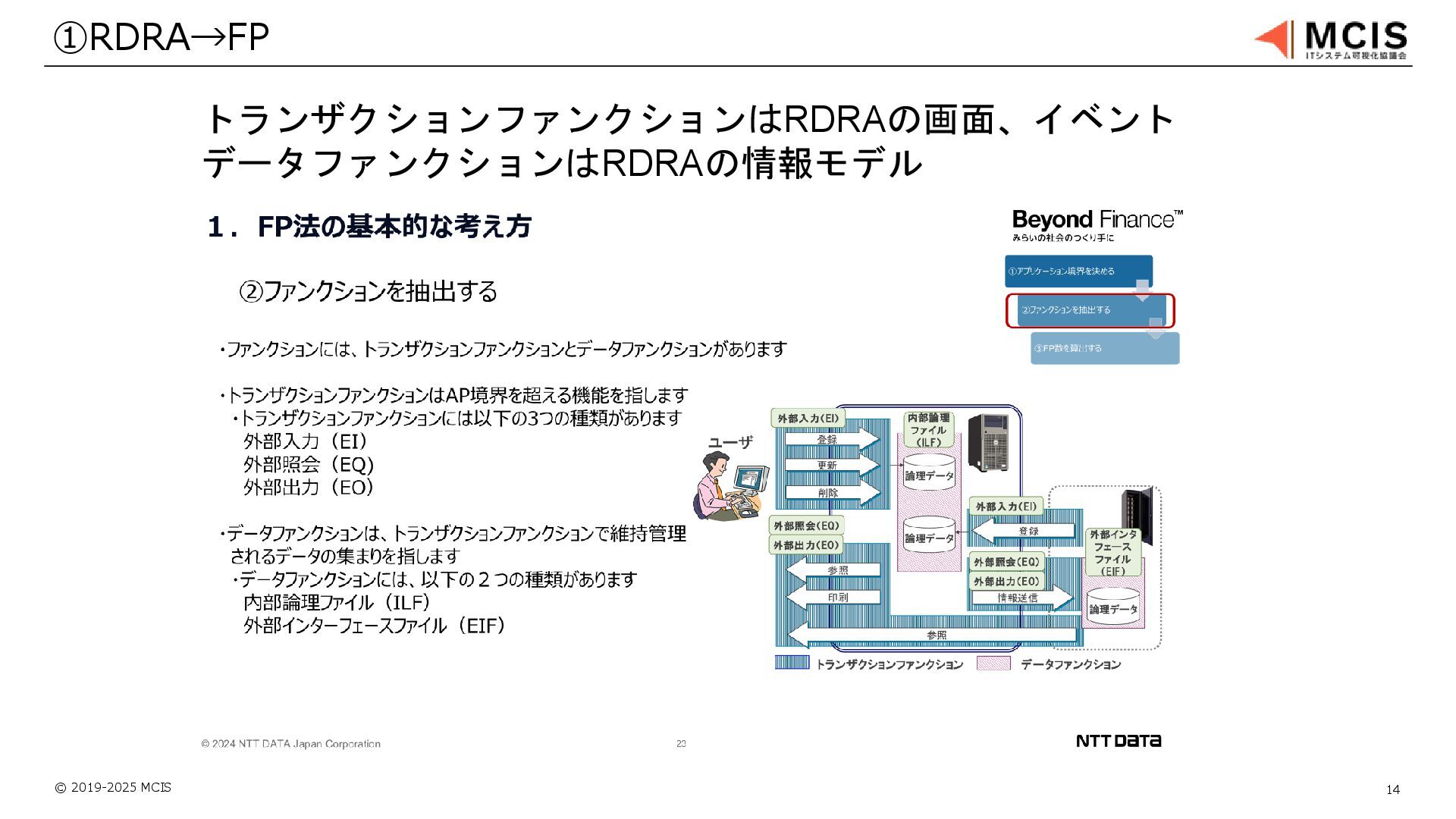 © 2019-2025 MCIS 14 ①RDRA→FP トランザクションファンクションはRDRAの画面、イベント データファンクションはRDRAの情報モデル