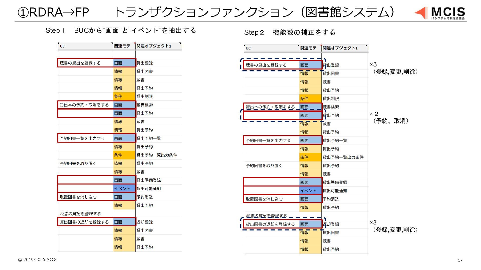 © 2019-2025 MCIS 17 ①RDRA→FP トランザクションファンクション(図書館システム) Step1 BUCから“画面”と“イベント”を抽出する Step2 機能数の補正をする