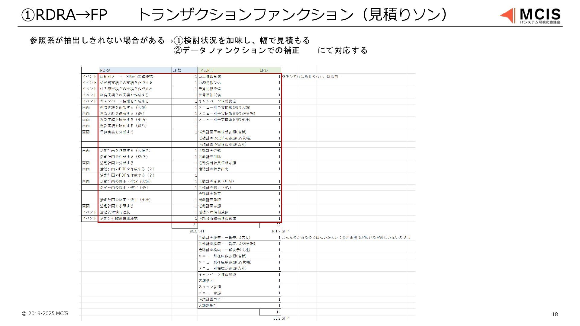 © 2019-2025 MCIS 18 ①RDRA→FP トランザクションファンクション(見積りソン) 参照系が抽出しきれない場合がある→①検討状況を加味し、幅で見積もる ②データファンクションでの補正 にて対応する