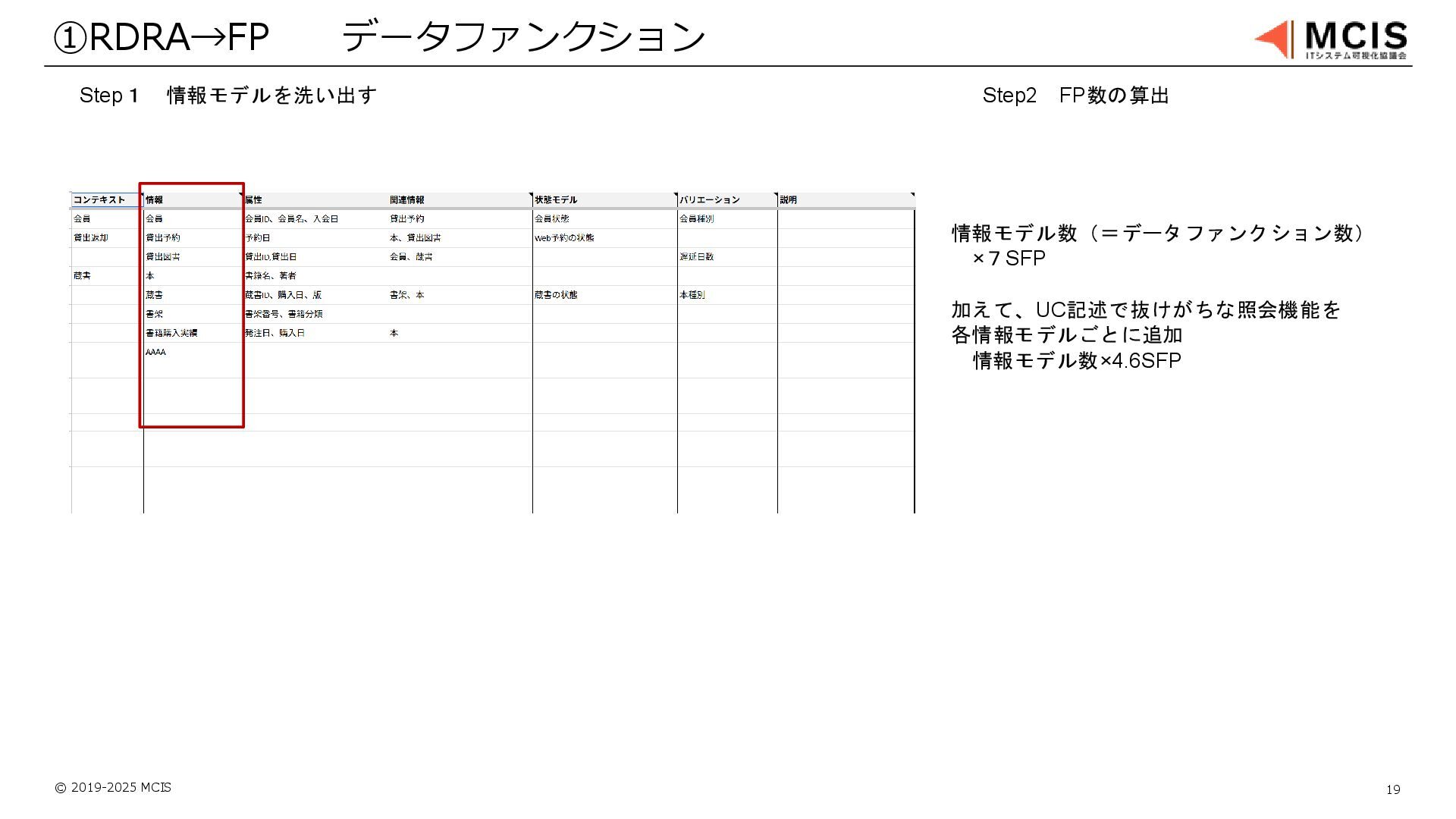 © 2019-2025 MCIS 19 ①RDRA→FP データファンクション Step1 情報モデルを洗い出す Step2 FP数の算出