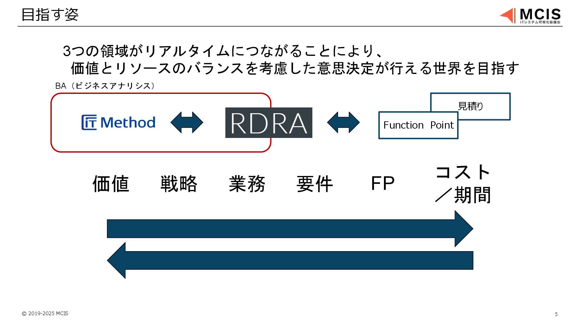 © 2019-2025 MCIS 5 目指す姿 見積り Function Point 3つの領域がリアルタイムにつながることにより、 価値とリソースのバランスを考慮した意思決定が行える世界を目指す