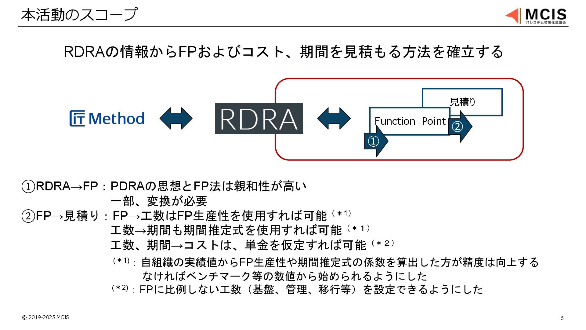 © 2019-2025 MCIS 6 本活動のスコープ 見積り Function Point RDRAの情報からFPおよびコスト、期間を見積もる方法を確立する ①