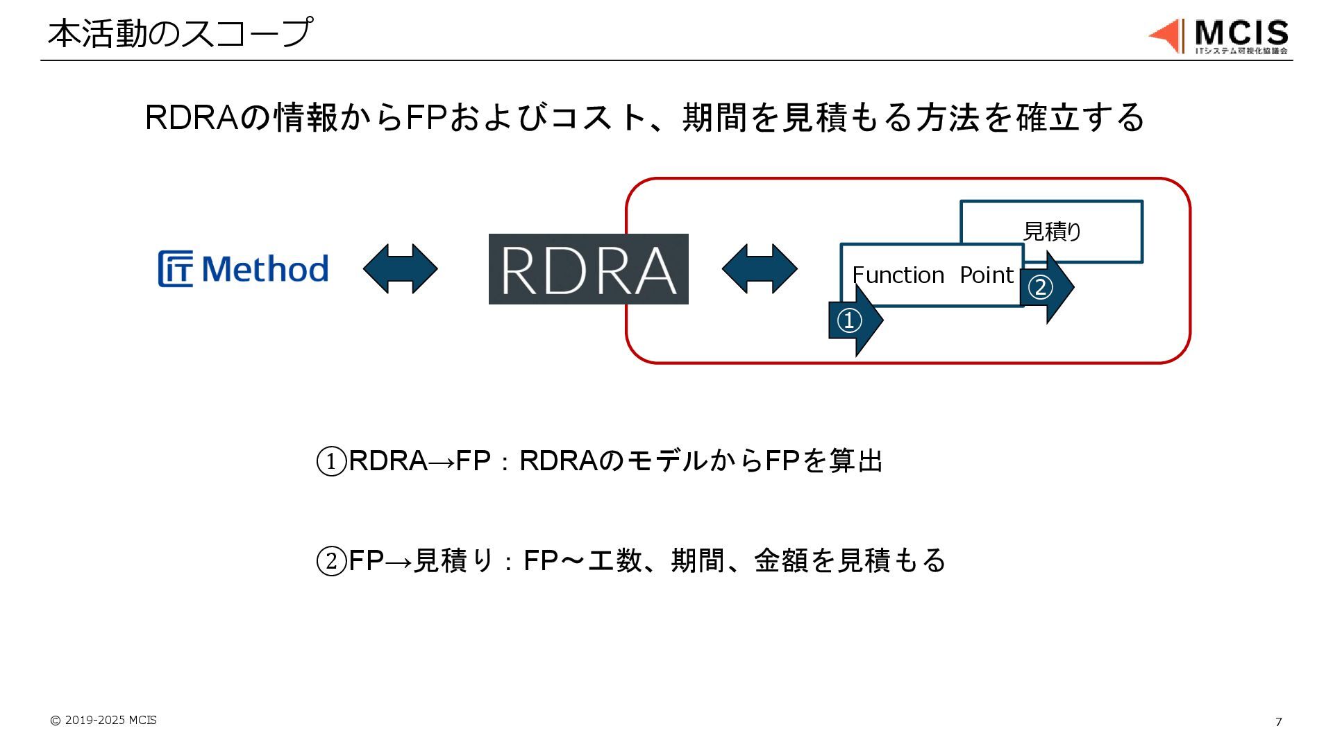 © 2019-2025 MCIS 7 本活動のスコープ 見積り Function Point RDRAの情報からFPおよびコスト、期間を見積もる方法を確立する ①