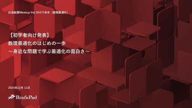 = 1, 2, …, 17 :人の集合 𝐽 = {1, 2, …, 5}:チームの集合 𝐼𝑙𝑒𝑎𝑑𝑒𝑟 = 1, 3, 6, 10, 14, 16 :リーダー気質の人の集合 𝐾 = {Science, Information, Social}:専攻の種別の集合 あなたはミニプロジェクトのチーム決めを任されました。新卒1 年目の方々と話し合った結果、4つの条件を考慮したチームの組 合せを考えることにしました。 • 17名を5チームに割り当てる • 各チームにリーダー気質のメンバーを1人以上割り当てる • すべてのチームの分析演習スコアが均一になるようにする • 大学時代の専攻を「理学系」「情報系」「社会科学系」の3 カテゴリに分けて、それぞればらけるようにする 𝑗∈𝐽 (𝑧𝑗 + + 𝑧𝑗 −) + 𝑘∈𝐾 𝑧𝑘 𝑗∈𝐽 𝑥𝑖,𝑗 = 1 , 3 ≤ 𝑖∈𝐼 𝑥𝑖,𝑗 ≤ 4 , 𝑖∈𝐼𝑙𝑒𝑎𝑑𝑒𝑟 𝑥𝑖,𝑗 ≥ 1 , −𝑧𝑗 − ≤ 𝑖∈𝐼 𝑆𝑐𝑜𝑟𝑒𝑖 𝑥𝑖,𝑗 − 𝑆𝑐𝑜𝑟𝑒_𝑎𝑣𝑒𝑟𝑎𝑔𝑒 ≤ 𝑧𝑗 + , 𝑖∈𝐼 𝑀𝑎𝑗𝑜𝑟𝑖,𝑘 𝑥𝑖,𝑗 − σ𝑖∈𝐼 𝑀𝑎𝑗𝑜𝑟𝑖,𝑘 5 ≤ 𝑧𝑘 , minimize subject to 𝑧𝑗 +, 𝑧𝑗 − ≥ 0, 𝑥𝑖,𝑗 ∈ 0, 1 . ∀𝑖 ∈ 𝐼 ∀𝑗 ∈ 𝐽 ∀𝑗 ∈ 𝐽 ∀𝑗 ∈ 𝐽 ∀𝑗 ∈ 𝐽, 𝑘 ∈ 𝐾 ∀𝑗 ∈ 𝐽 ∀𝑖 ∈ 𝐼, 𝑗 ∈ 𝐽