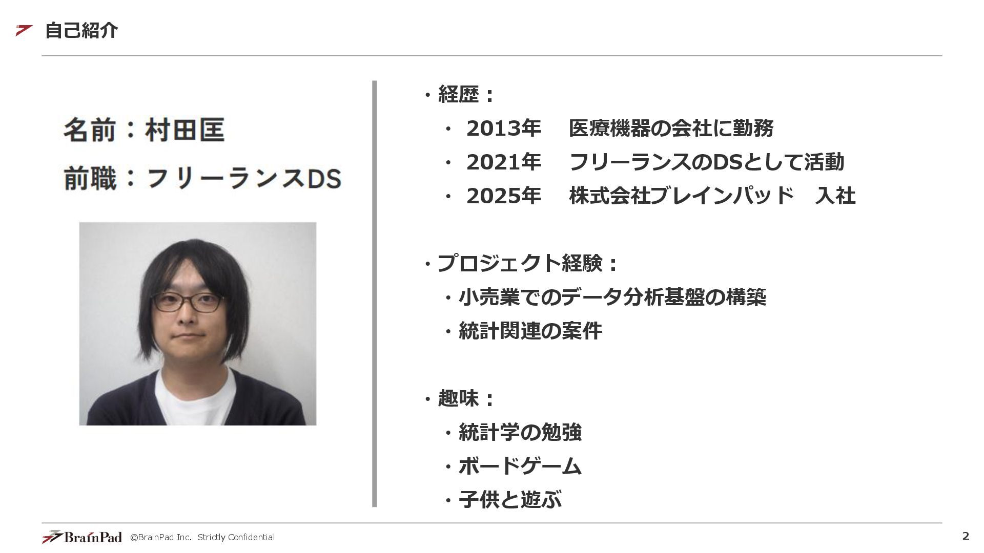 ©BrainPad Inc. Strictly Confidential 2 自己紹介 ・経歴: ・ 2013年 医療機器の会社に勤務