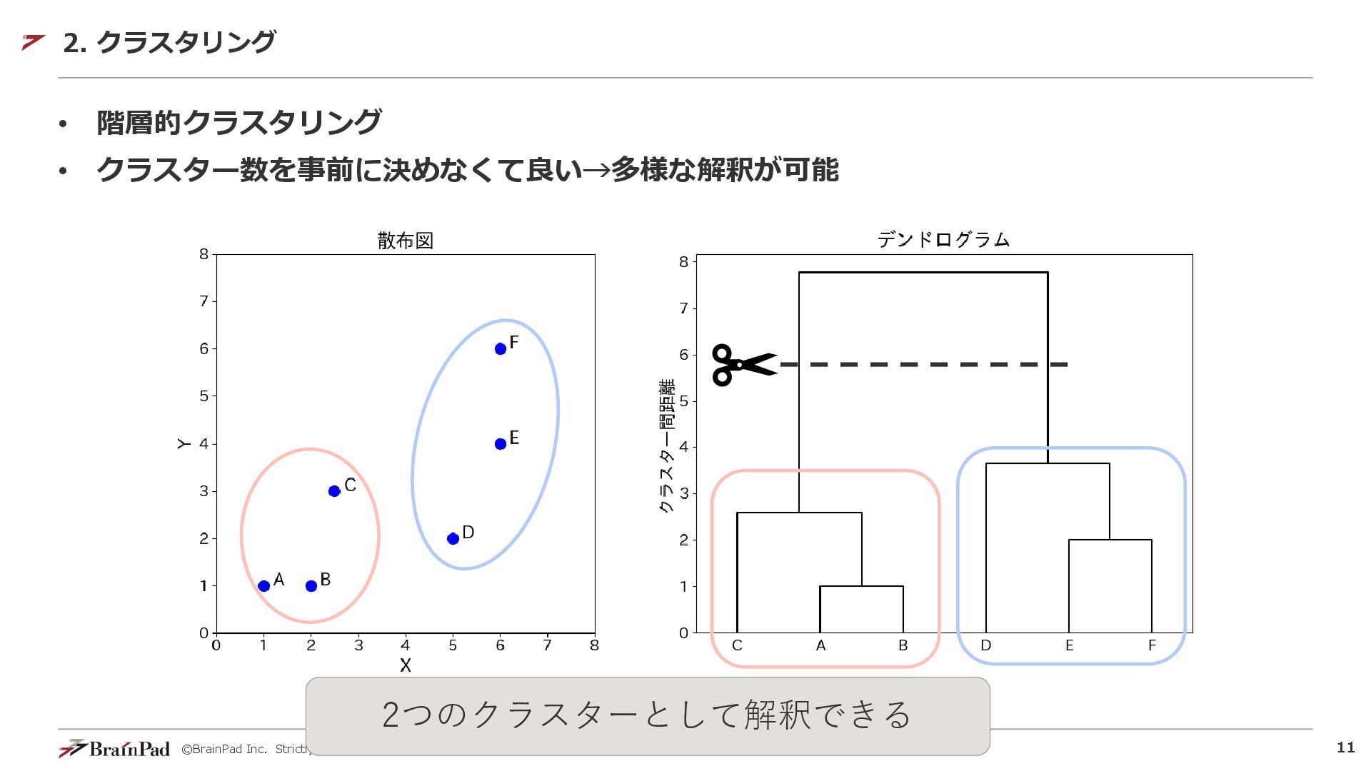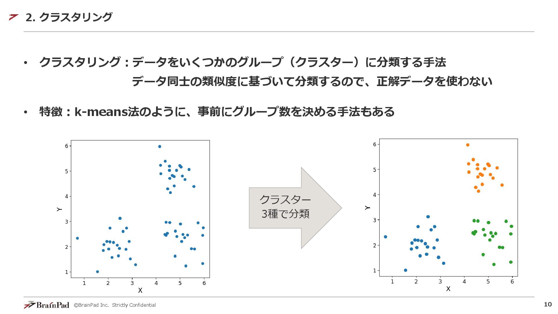 ©BrainPad Inc. Strictly Confidential 10 • クラスタリング:データをいくつかのグループ(クラスター)に分類する手法 データ同士の類似度に基づいて分類するので、正解データを使わない • 特徴:k-means法のように、事前にグループ数を決める手法もある