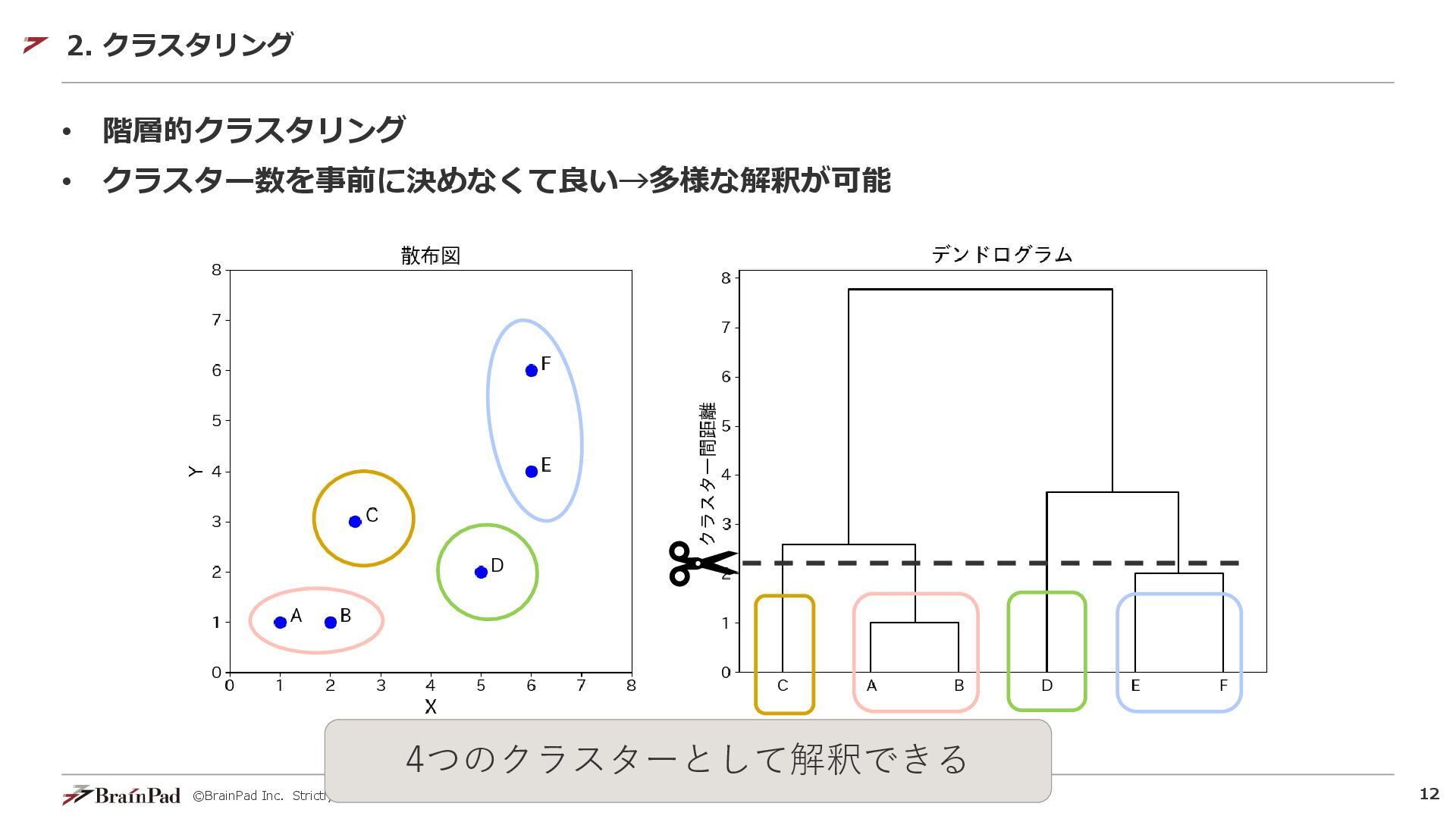 ©BrainPad Inc. Strictly Confidential 11 • 階層的クラスタリング • クラスター数を事前に決めなくて良い→多様な解釈が可能 2.