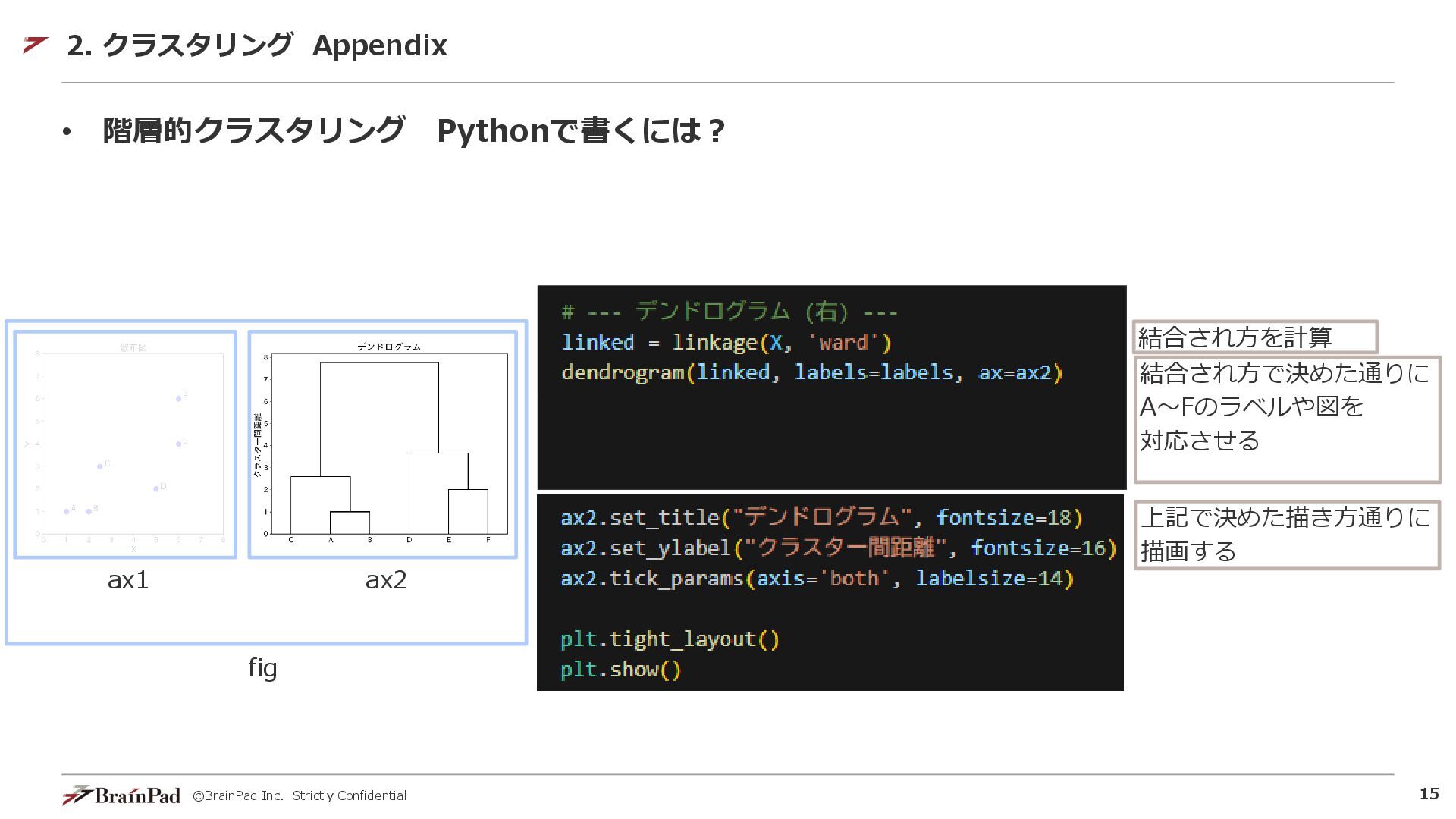 ©BrainPad Inc. Strictly Confidential 14 • 階層的クラスタリング Pythonで書くには? 2. クラスタリング