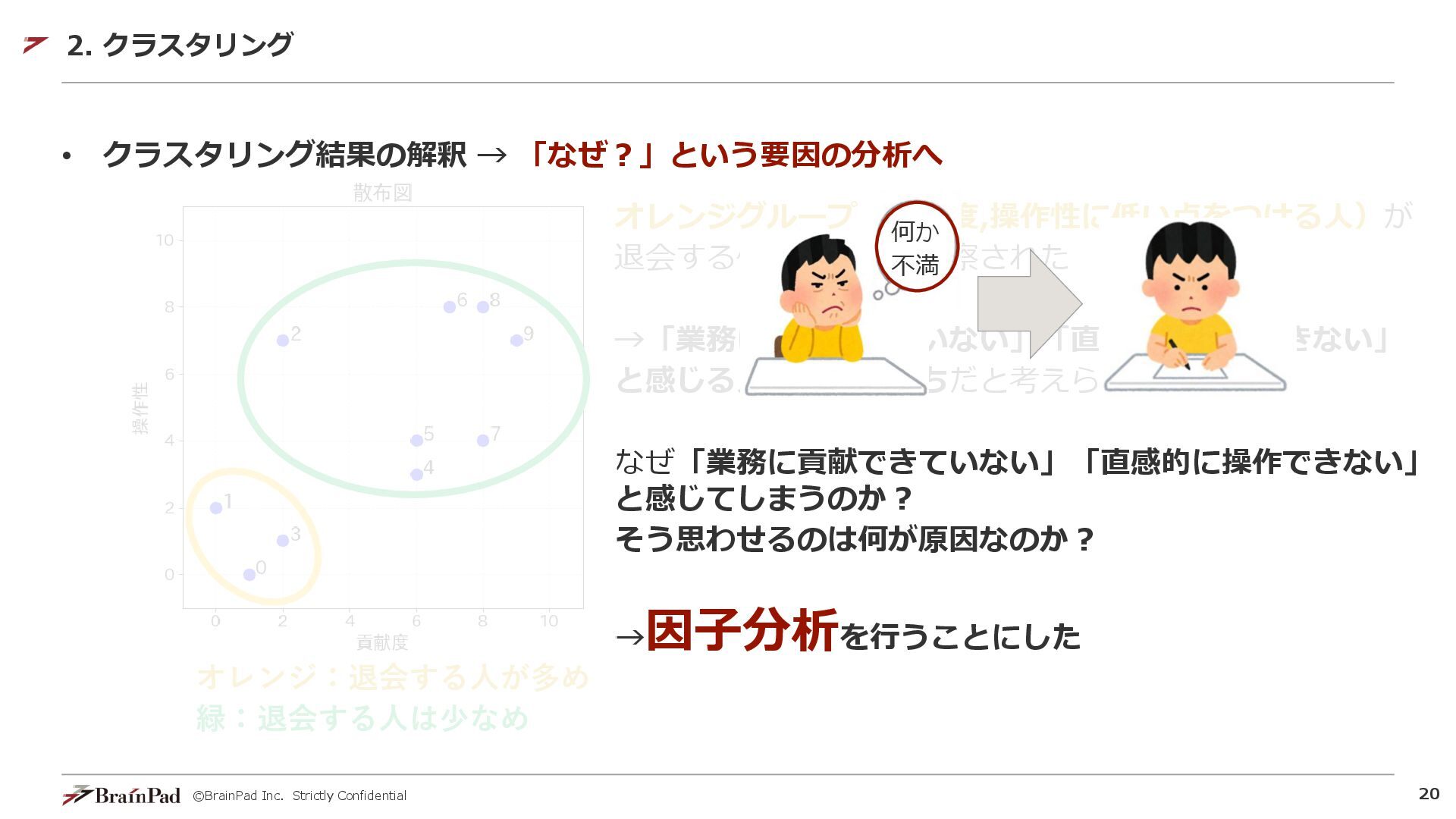 ©BrainPad Inc. Strictly Confidential 20 • クラスタリング結果の解釈 → 「なぜ?」という要因の分析へ 2.
