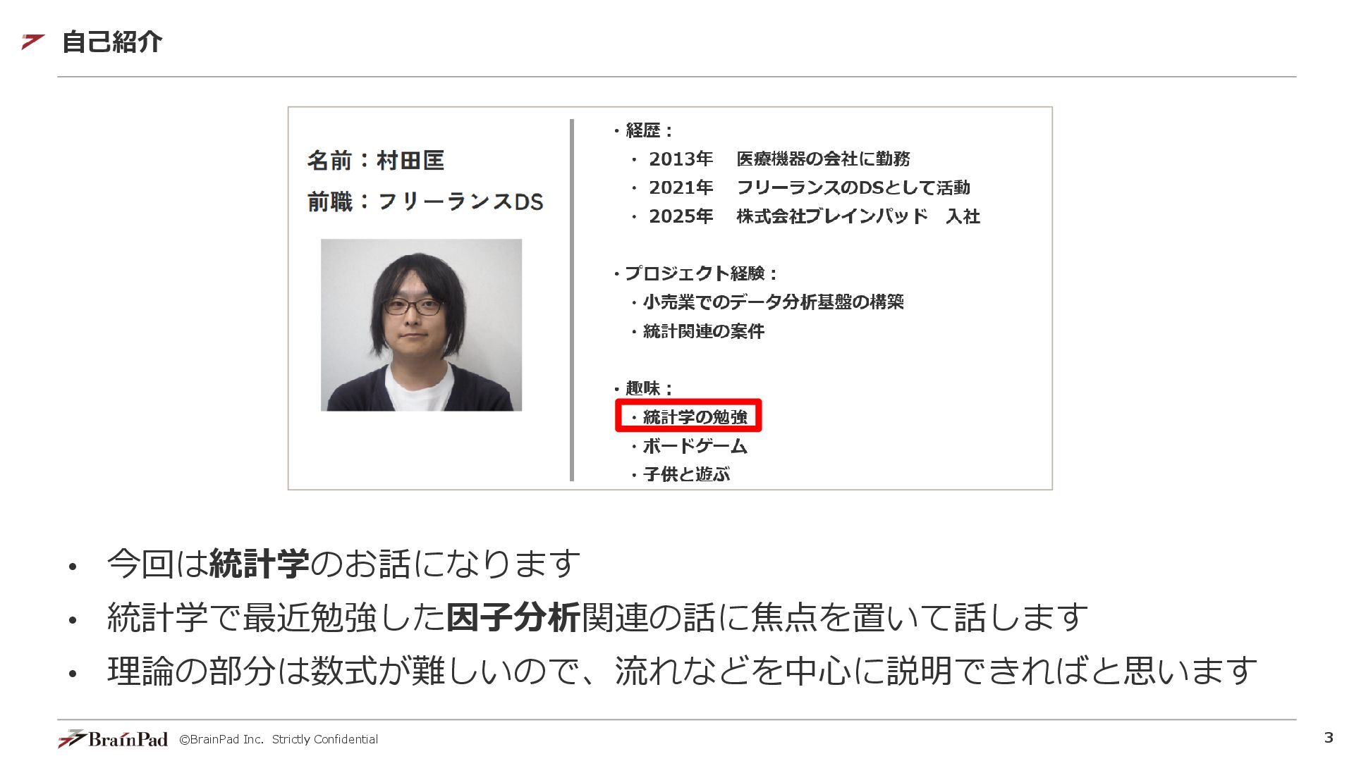©BrainPad Inc. Strictly Confidential 3 自己紹介 • 今回は統計学のお話になります • 統計学で最近勉強した因子分析関連の話に焦点を置いて話します
