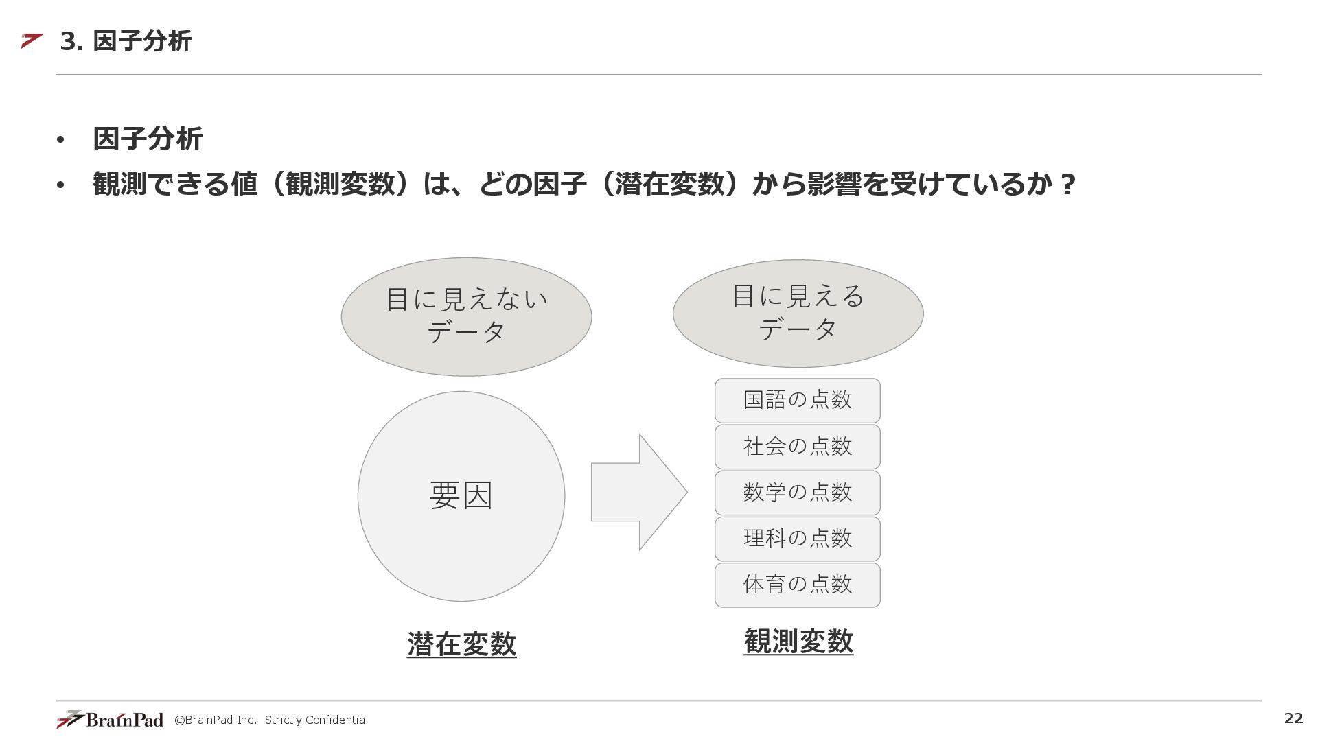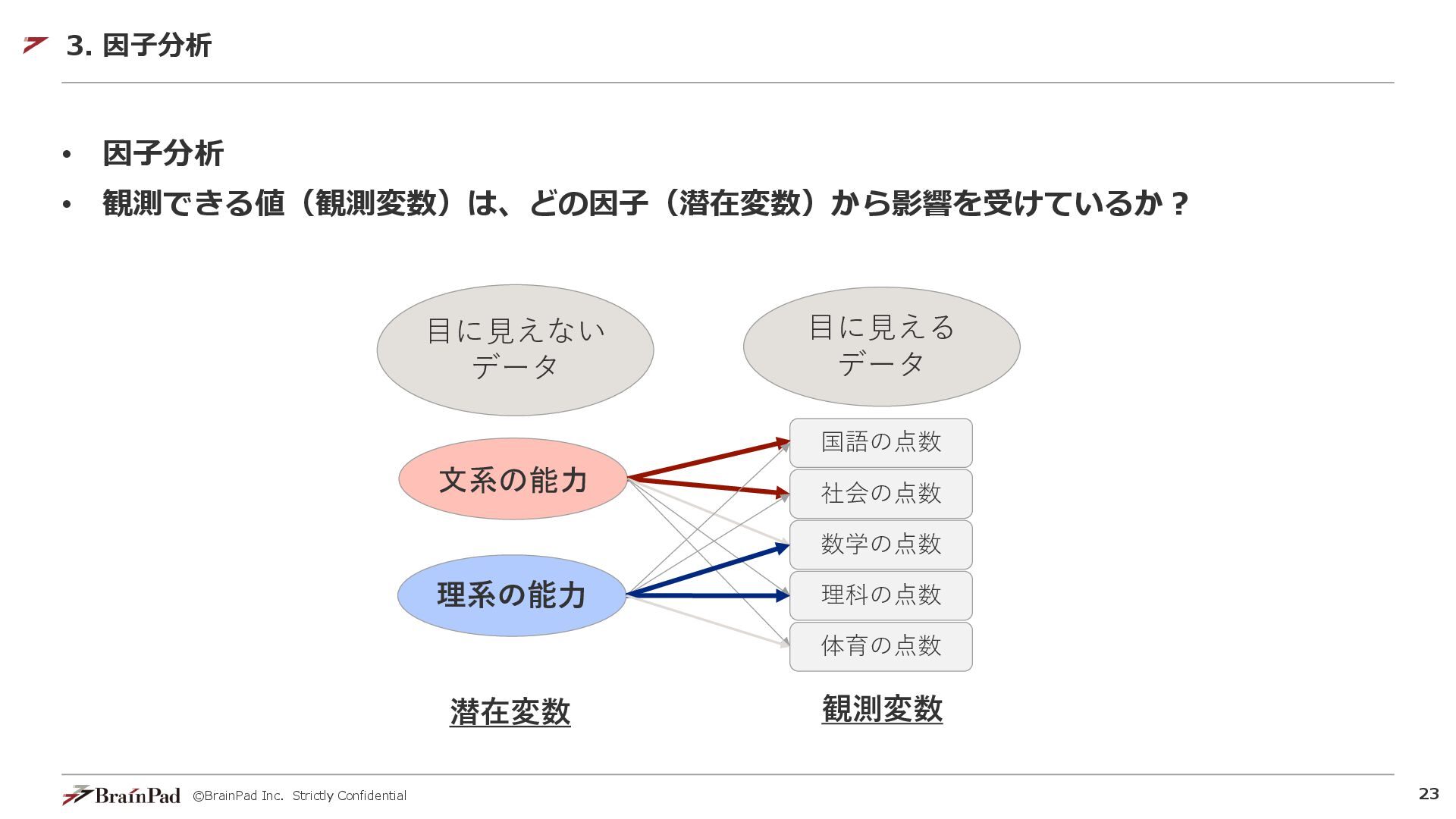 ©BrainPad Inc. Strictly Confidential 22 • 因子分析 • 観測できる値(観測変数)は、どの因子(潜在変数)から影響を受けているか? 3.
