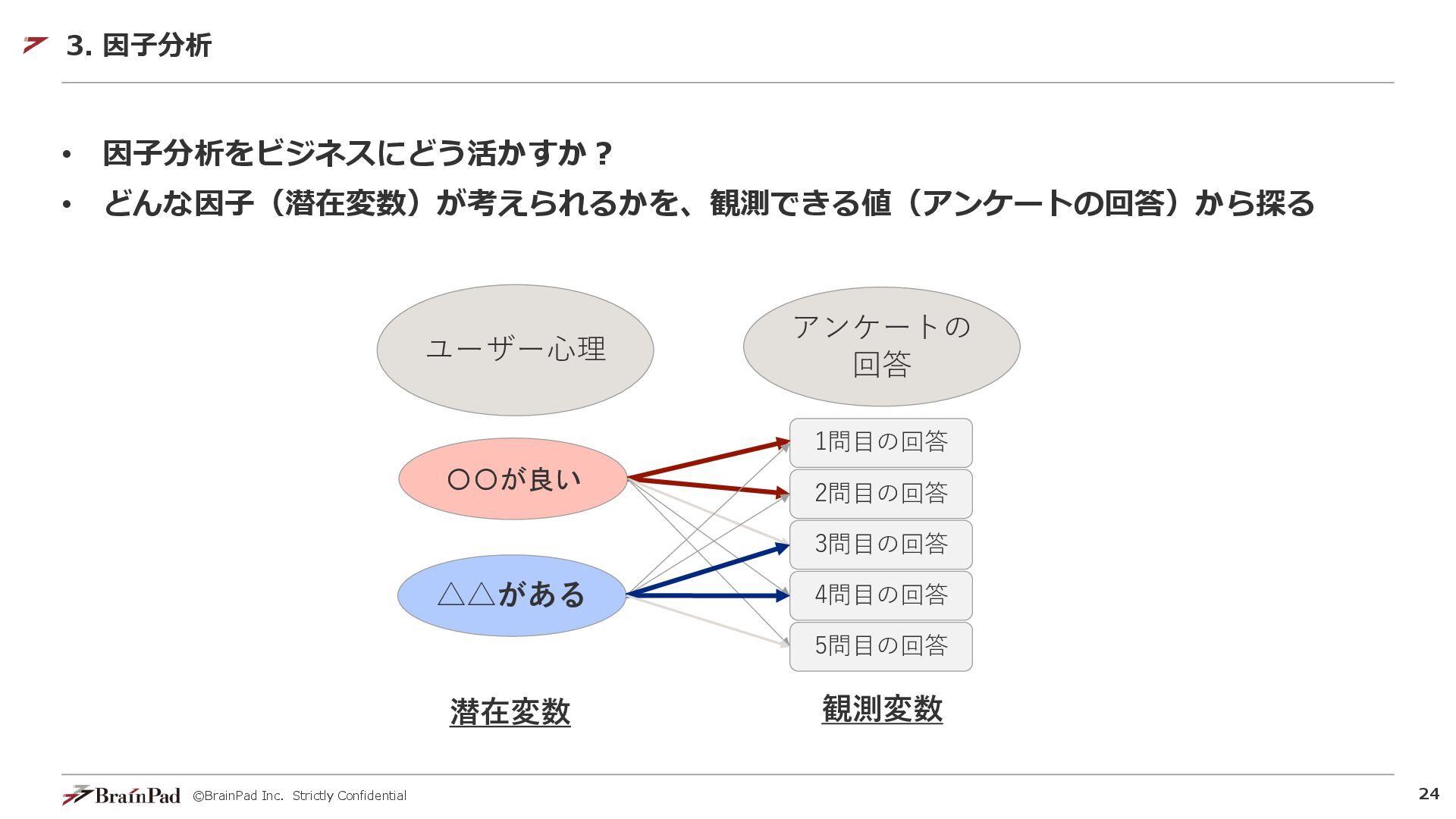 ©BrainPad Inc. Strictly Confidential 23 • 因子分析 • 観測できる値(観測変数)は、どの因子(潜在変数)から影響を受けているか? 3.