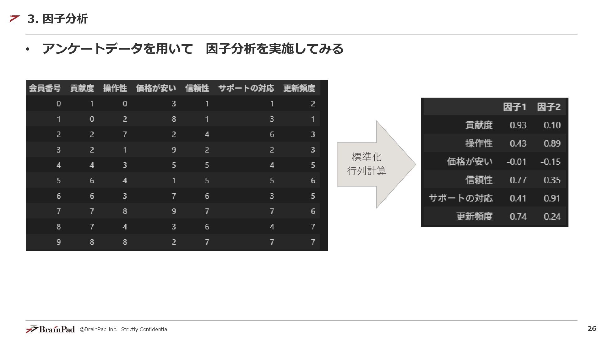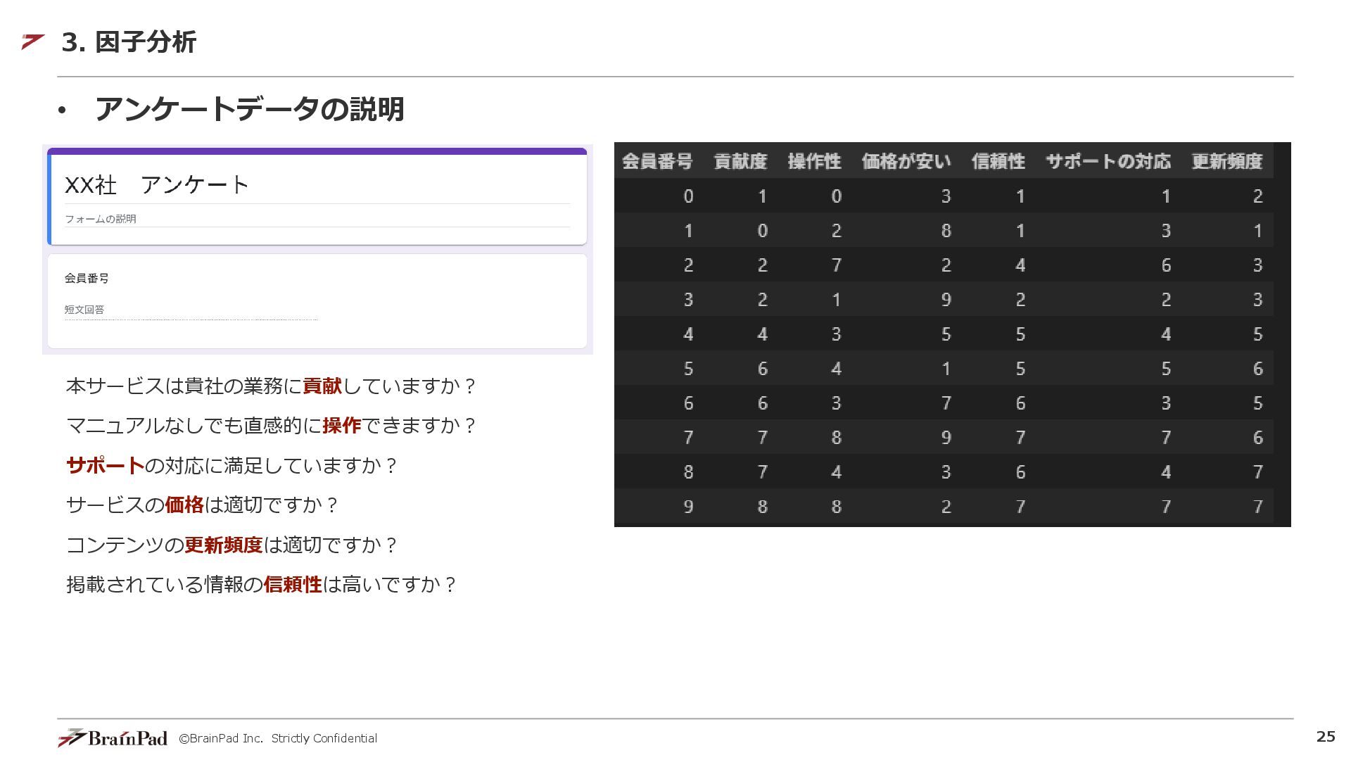 ©BrainPad Inc. Strictly Confidential 24 • 因子分析をビジネスにどう活かすか? • どんな因子(潜在変数)が考えられるかを、観測できる値(アンケートの回答)から探る 3.