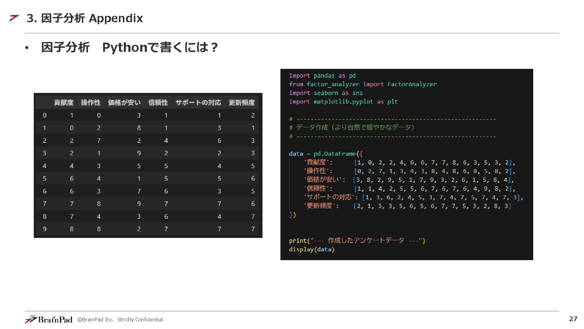 ©BrainPad Inc. Strictly Confidential 26 • アンケートデータを用いて 因子分析を実施してみる 3. 因子分析