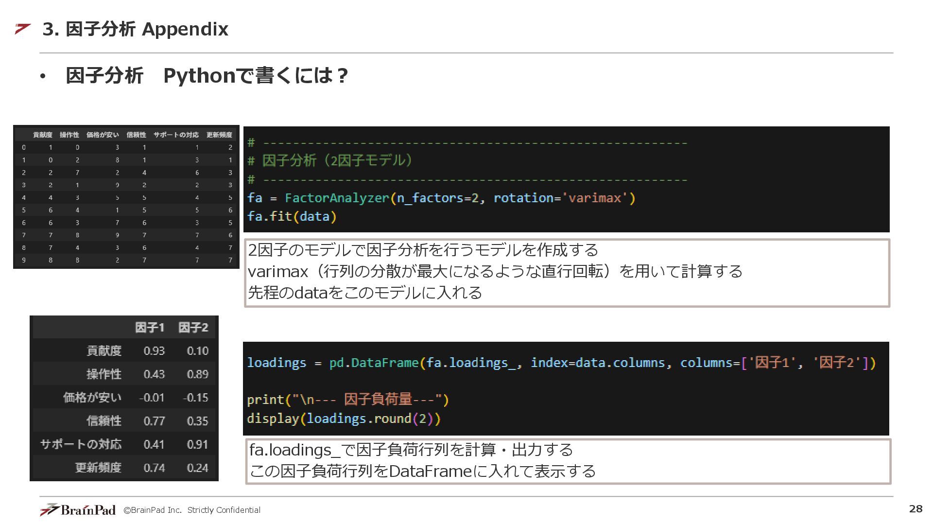 ©BrainPad Inc. Strictly Confidential 27 • 因子分析 Pythonで書くには? 3. 因子分析