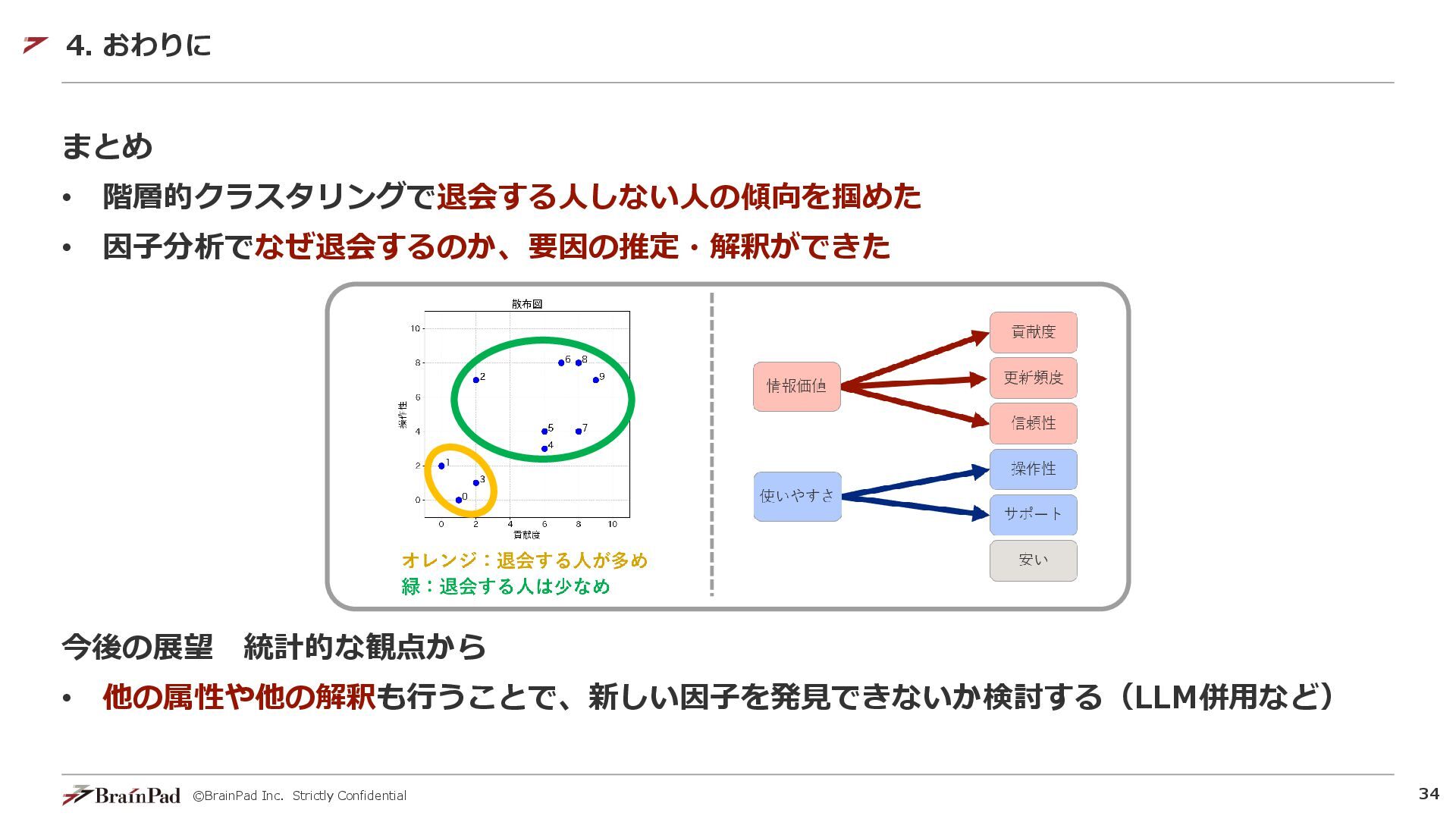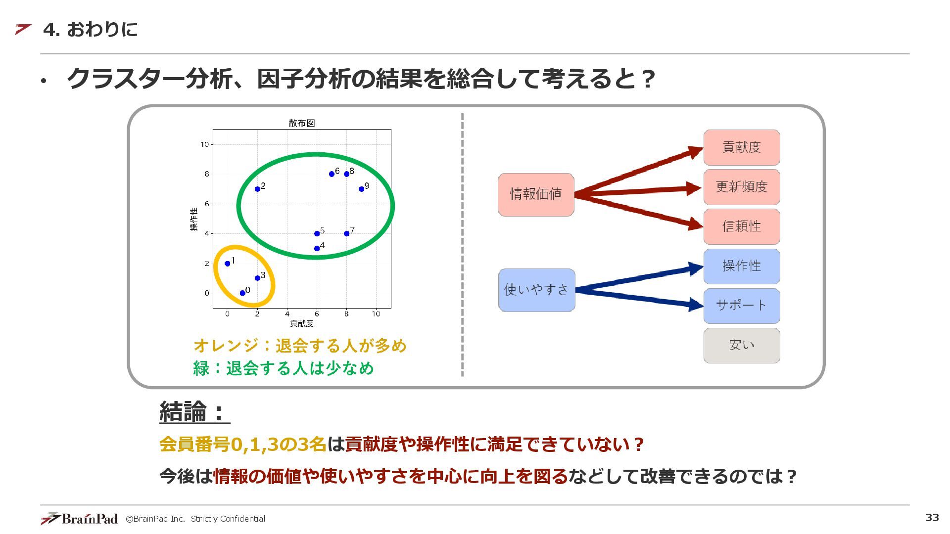 ©BrainPad Inc. Strictly Confidential 33 • クラスター分析、因子分析の結果を総合して考えると? 4. おわりに 結論: