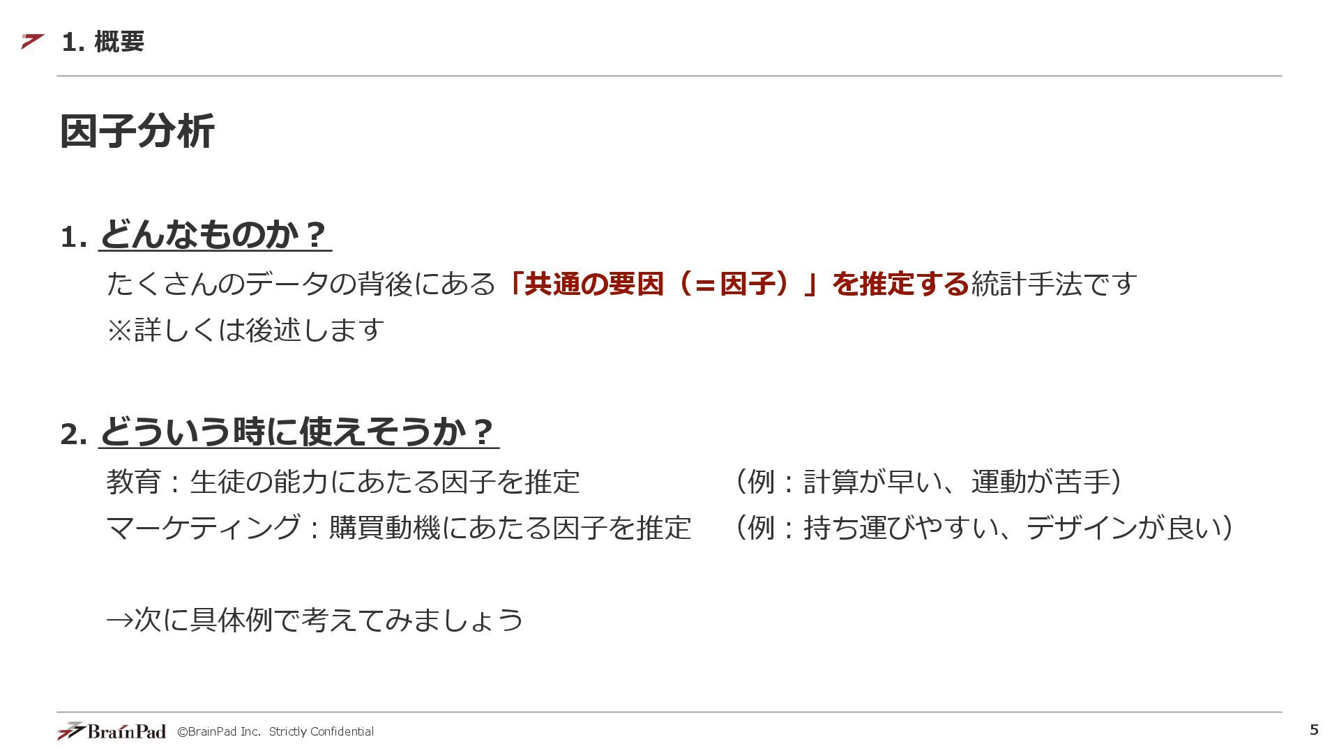 ©BrainPad Inc. Strictly Confidential 5 因子分析 1. どんなものか? たくさんのデータの背後にある「共通の要因(=因子)」を推定する統計手法です ※詳しくは後述します