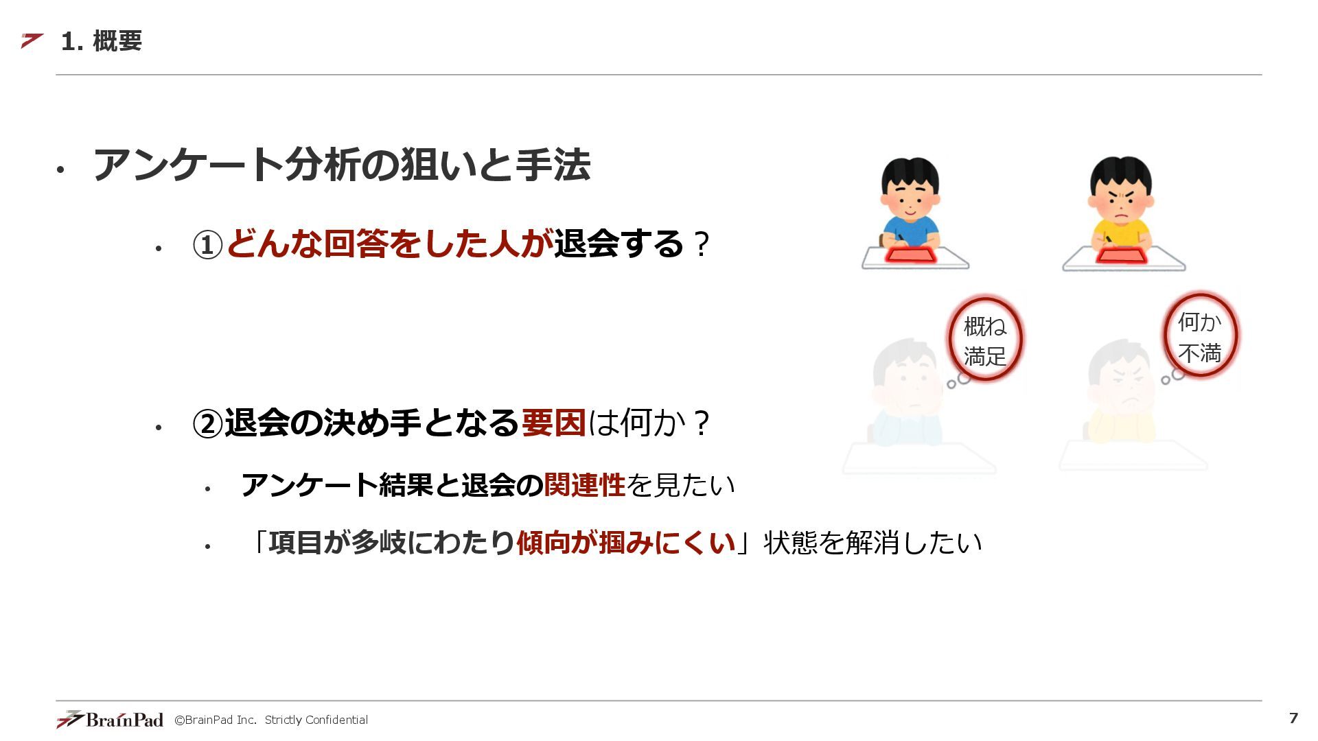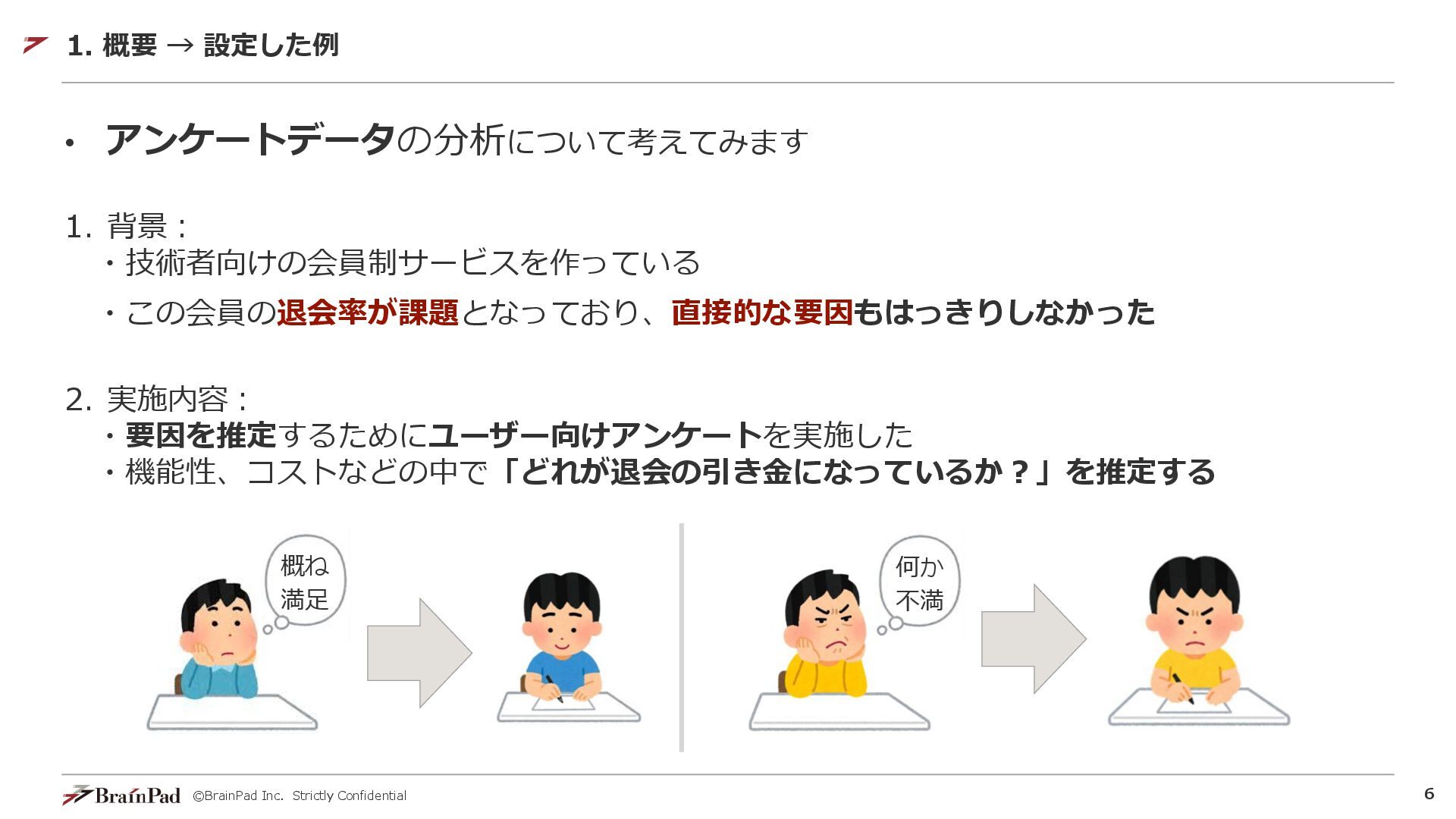 ©BrainPad Inc. Strictly Confidential 6 • アンケートデータの分析について考えてみます 1. 背景: ・技術者向けの会員制サービスを作っている