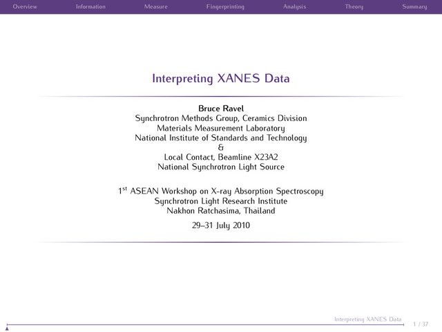 Bruce Ravel Synchrotron Methods Group, Ceramics Division Materials Measurement Laboratory National Institute of Standards and Technology & Local Contact, Beamline X23A2 National Synchrotron Light Source 1st ASEAN Workshop on X-ray Absorption Spectroscopy Synchrotron Light Research Institute Nakhon Ratchasima, Thailand 29–31 July 2010 1 / 37 Interpreting XANES Data