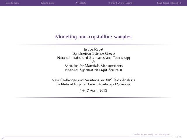 samples Bruce Ravel Synchrotron Science Group National Institute of Standards and Technology & Beamline for Materials Measurements National Synchrotron Light Source II New Challenges and Solutions for XAS Data Analysis Institute of Physics, Polish Academy of Sciences 14-17 April, 2015 1 / 18 Modeling non-crystalline samples