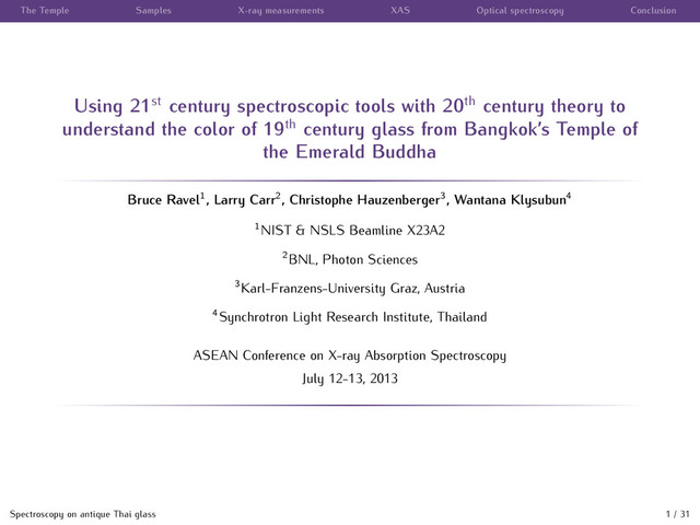 21st century spectroscopic tools with 20th century theory to understand the color of 19th century glass from Bangkok’s Temple of the Emerald Buddha Bruce Ravel1, Larry Carr2, Christophe Hauzenberger3, Wantana Klysubun4 1NIST & NSLS Beamline X23A2 2BNL, Photon Sciences 3Karl-Franzens-University Graz, Austria 4Synchrotron Light Research Institute, Thailand ASEAN Conference on X-ray Absorption Spectroscopy July 12-13, 2013 Spectroscopy on antique Thai glass 1 / 31
