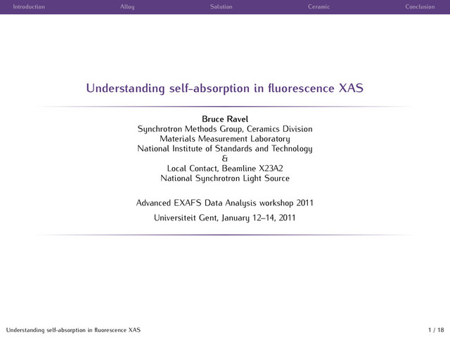 Bruce Ravel Synchrotron Methods Group, Ceramics Division Materials Measurement Laboratory National Institute of Standards and Technology & Local Contact, Beamline X23A2 National Synchrotron Light Source Advanced EXAFS Data Analysis workshop 2011 Universiteit Gent, January 12–14, 2011 Understanding self-absorption in fluorescence XAS 1 / 18