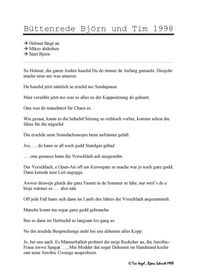 Schmitt 1998 Tim Nagel , Björn Schmitt 1998 Tim Nagel , Björn Schmitt 1998 De WieNa reißt die Karde ab, de Berno zäht es Wechselgeld onn die annere Akteure belagere met Sack onn pack die Umkleidekabin. Dort es dann der Ausnahmezustand eingetreten. E Deunanner, wie wenn e Bomb engschlah hätt. Wie gesaat, do plaggt jeder sei Zeich dohinne irgendwo hin. So es schon manscher met em falsche Kostüm off die Bühn gerannt. Äner vom Männerbalett hats sogar geschafft, sich en e Klädsche von de Minigarde e renn se zwänge. Do es so e Deunanner, daß De Sprudellouis e mol ohne Text off de Bühn gehen muschd, ... weil er däne do hinne in dem Chaos nimme gefunn hat. Iwerens, getrennte Kabine ham mier do hinne net. Do es Männlein onn Weiblein gemischt. Awwer net, daß jetzt nägschdjohr do alles nur weje der än Kabin bei de Fasent metmache will. Awwer off da Bühn ham ma genauso e Chaos. Gennauer gesaat, unner de Bühn, wie vor e paar johr, gelle Die Maxigarde war grad am Hupse, off ämol es soe Bühnedeil im hinnerschde Egge abgesackt. Mier drunner, de Tim sich met aller Gewalt degeje gestemmt, onn ich hann probiert, wedder de Bolze erenn se krien. ........ Hoode mier e Angst. Ma hann gemennt, die däde all off dem äne Deil stehn. Onn was das für Stature senn, kenne na euch jo noher angugge. Mier kennde noch viel meh verzehle, awwer dodefür langt die Zeit net. Mier hann nämlich e gennauer Zeitplan diesjohr. Denn misse ma genau enhalle. Das na noher a noch Zeit hann, für e paar Bier se tringe. Onn net gleich ens Bett misse. Außerdem kriem ma sonschd noch die Ohre lang gezoch. So Helmut, du kanschd dann jetzt widder Deunanner mache. Allee Hopp ! (beide)
