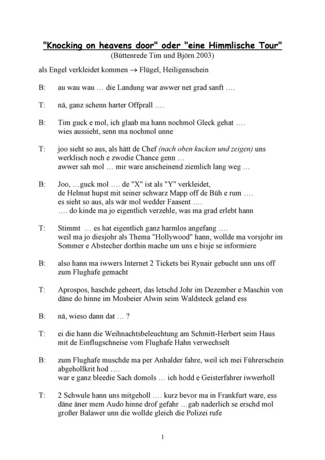 die Idee, dass se de Schrank nochmol ofbaue unn er sich dann ren stellt, damit er gugge kann, was passiert, wenn de Pendolino vorbei kommt …. Gesaat gedon, se baue de Schloofzimmerschrank unn de Marco krawelt eren - in dem Moment kommt de Butsch häm …. kommt ens Schloofzemmer unn freut sich, dass es Nadja de Schrank schon offgebaut hat …. dann macht er die Deer off unn sieht de Marco do drin stehn …. "Was machschd dann du do", froht er ne …. unn de Marco saat: "Kamerad Butsch, du werschds ma jetzt wahrscheinlich net glawe, ….. ich warte off de Pendolino …." B: Sonndachs moins hann ma dann do vor de Kersch noch was erläbt …. de Müllersch Lothar es raus komm un hat im Gesicht off jedem Backe e roter Handabdruck gehat …. ich hann ne Gefroht, was dann passiert wär …. do fängt der ahn se verzehle … "Mir hann uns ewe in de Kerch zum bede hingekniet … unn vor mir war so eine junge Dame … wie die so sich gekniet hat, siehn ich, wie ihr Rock im Hinnere stecke bleibt … weil das so komisch ausgesieht hat, bin ich hin, unn han ne wedder raus gezoh ….. do dreht die sich rum unn schlaht mir met de Hand voll off de linge Backe …." "Oh", hann ich gesaat, "unn was ess mem rechde Backe passiert?" "Ei es bije späder hat sich äner näwe mich gesetzt, wie ma nochmol gebät hann, es der Rock schon wedder stecke blieb unn der näwer mir hat ne wedder raus gezoh …. do hann ich zum gesaat:" net, her off, die will das net" …. unn hann ne wedder rengesteckt … T: wo ma grad do unne in dem Egge senn … de Meiersch Peter hollt jo neuerdings Gesangsunnerischd ….. Unn immer wenn er es Singe üwe dut, dann geht die Meiersch Maria raus en de Garde Unkraut robbe …. damit die Nachbarschaft net mennt se würd ne schlahn …. B: Jo, jo de Peter … der sengt wie de Rembrand …. T: Rembrand … wieso das, de Rembrand war doch e Moler, der konnd doch gar net singe ….